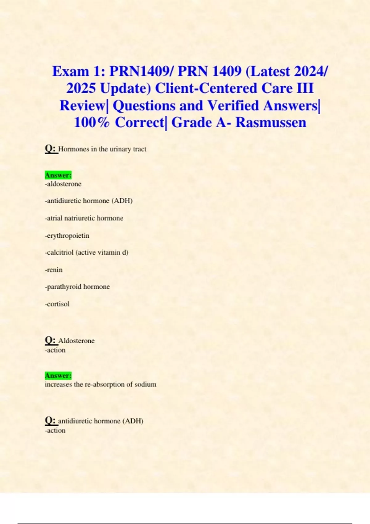 Exam 1: PRN1409/ PRN 1409 (Latest 2024/ 2025 Update) Client-Centered Care III Review| Questions and Verified Answers| 100% Correct| Grade A- Rasmussen