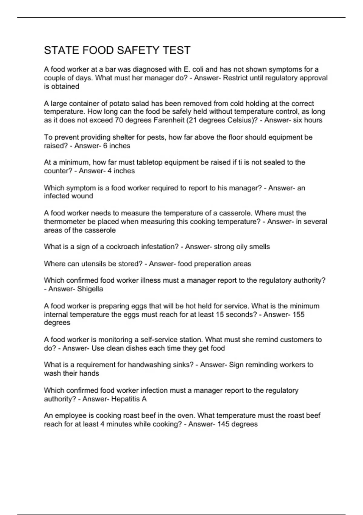 Exam (elaborations) State Food Safety Test questions and answers 2 Exam (elaborations) STATE FOOD SAFETY PRACTICE EXAM, STATE FOOD SAFETY 3 Exam (elaborations) FOOD SAFETY MANAGER TRAINING Q&A 2024 4 Exam (elaborations) FOOD SAFETY CERTIFICATION QUESTIONS AND ANSWERS 5 Exam (elaborations) STATE FOOD SAFETY PRACTICE EXAM, STATE FOOD SAFETY 6 Ex