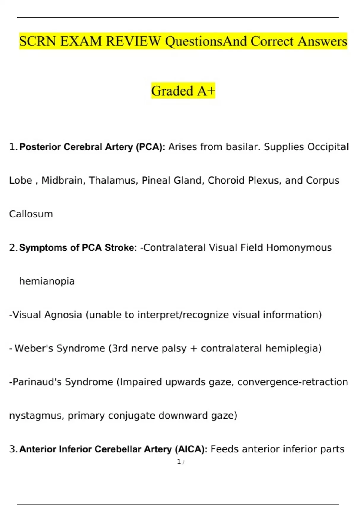 SCRN Exam Review (Stroke Syndromes) Questions and Answers