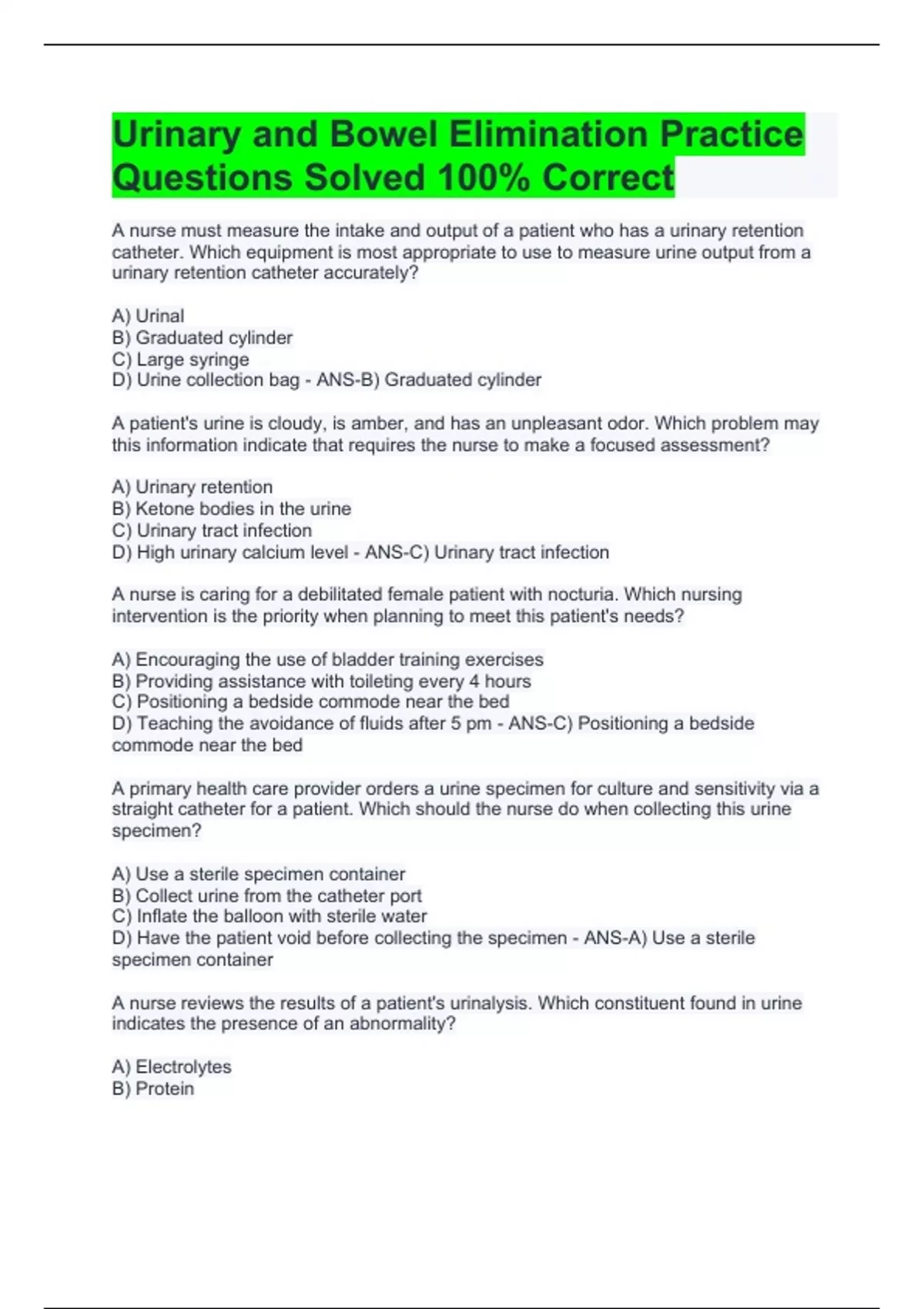 1 Exam (elaborations) Urinary and Bowel Elimination Practice Questions Solved 100% Correct 2 Exam (elaborations) RN Alterations in Digestion and Bowel Elimination Assessment Questions and Answers 3 Exam (elaborations) Nclex Practice Questions and Answers - Bowel Elimination 4 Exam (elaborations) Fundamentals of Nursing-Chapter 47-Bowel Eliminati