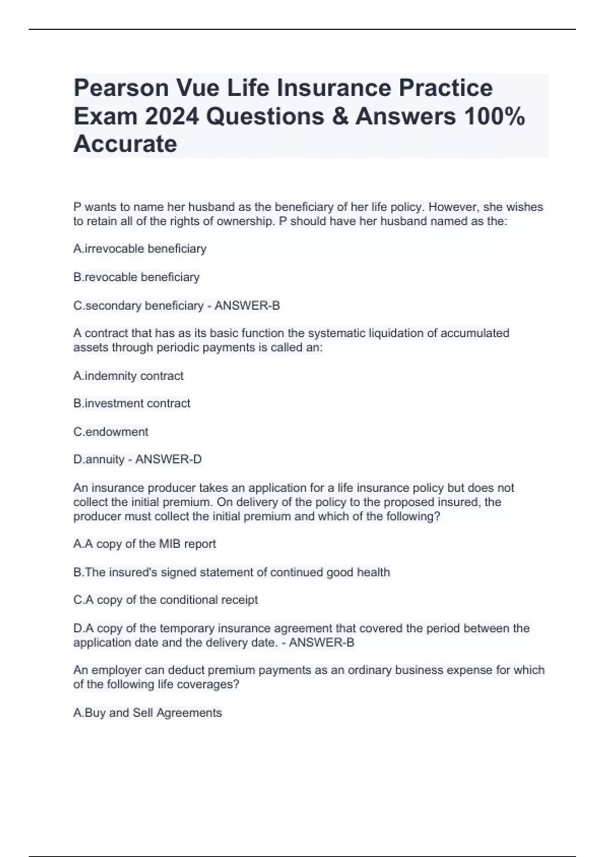 Pearson Vue Life Insurance Practice Exam 2024 Questions & Answers 100% Accurate