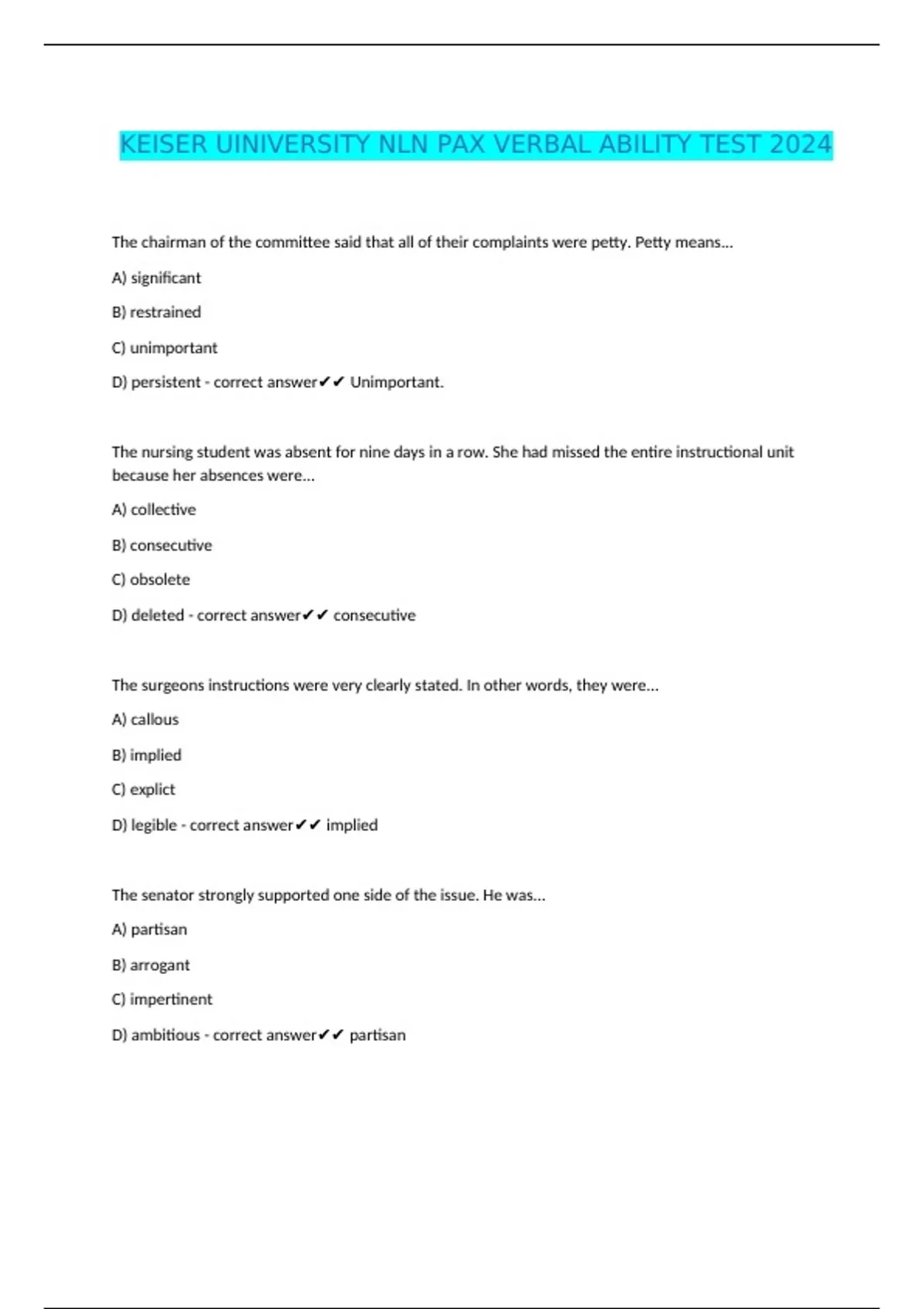 KEISER UNIVERSITY NLN PAX EXAM 2024 WITH 100% ACCURATE SOLUTIONS KEISER UNIVERSITY NLN PAX EXAM 2024 WITH 100% ACCURATE ANSWERS