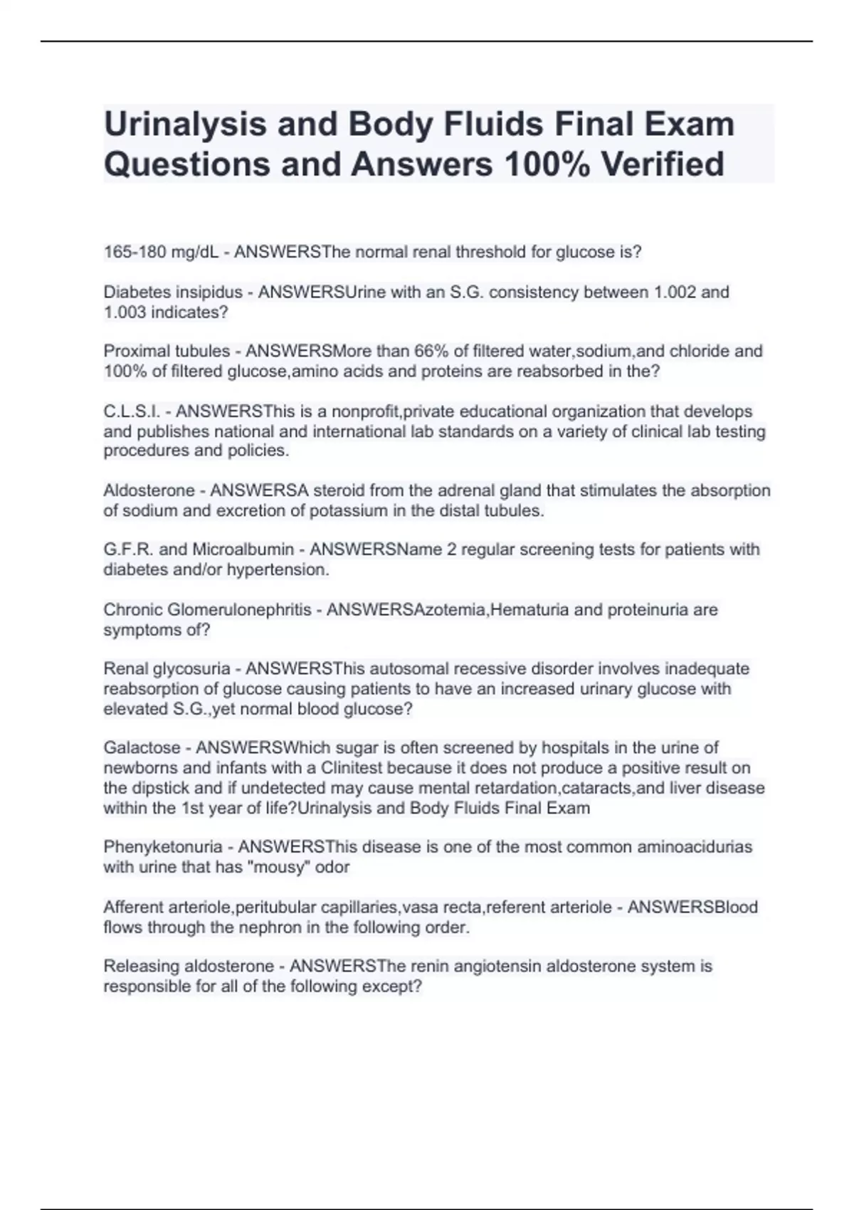PACKAGE DEAL FOR Urinalysis and Body Fluids Questions & Answers 100% PACKAGE DEAL FOR Urinalysis and Body Fluids Questions & Answers 100% PACKAGE DEAL FOR Urinalysis and Body Fluids Questions & Answers 100% Veified
