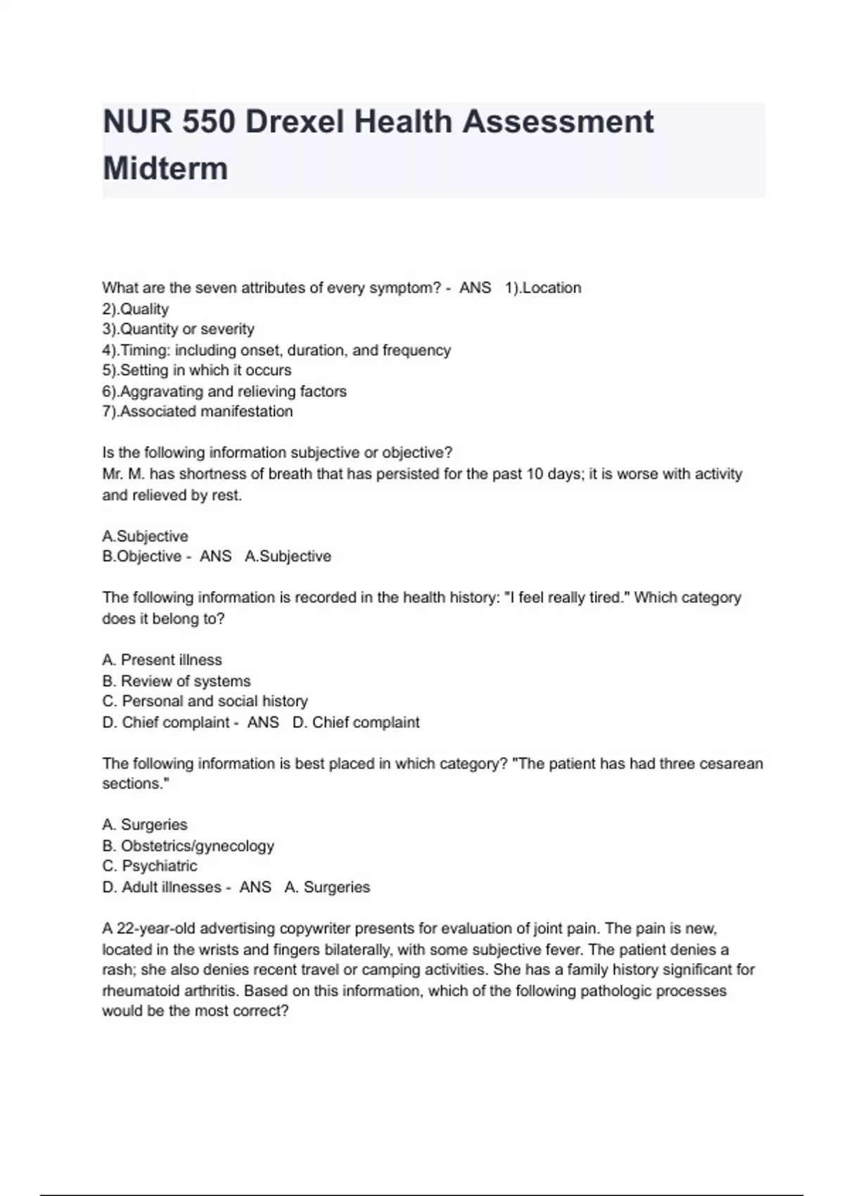 NUR 550 Drexel Health Assessment Midterm Exam Questions And Answers Package Deal