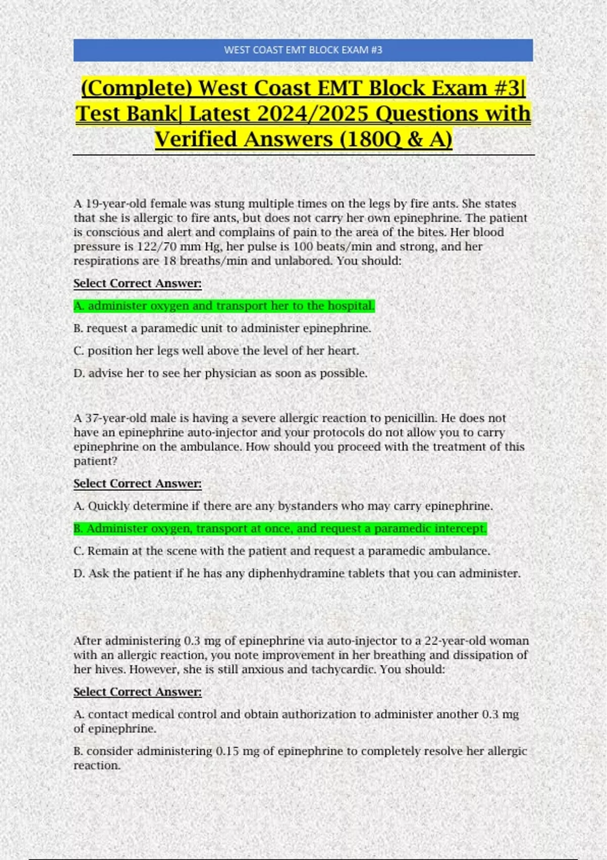 Complete; West Coast EMT Block Exam #3/West Coast EMT Block 3 Exam (Latest 2024/2025) Questions With Verified Answers | Verified,Complete; West Coast EMT Block Exam #3/West Coast EMT Block 3 Exam (Latest 2024/2025) Questions With Verified Answers | Verified