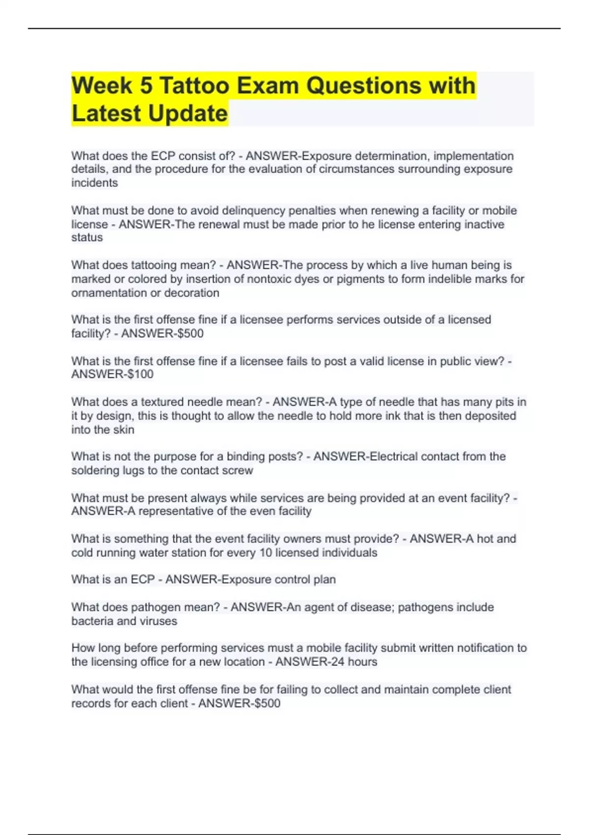Exam (elaborations) Tattoo License Exam Test Guide Questions and Answers Exam (elaborations) Tattoo License Exam OR Questions with Correct Answers (100% Pass) Exam (elaborations) Tattoo finals Exam Questions with Complete Solutions Exam (elaborations) Tattoo Exam Questions with Latest Update Exam (elaborations) Tattoo Exam Questions with C