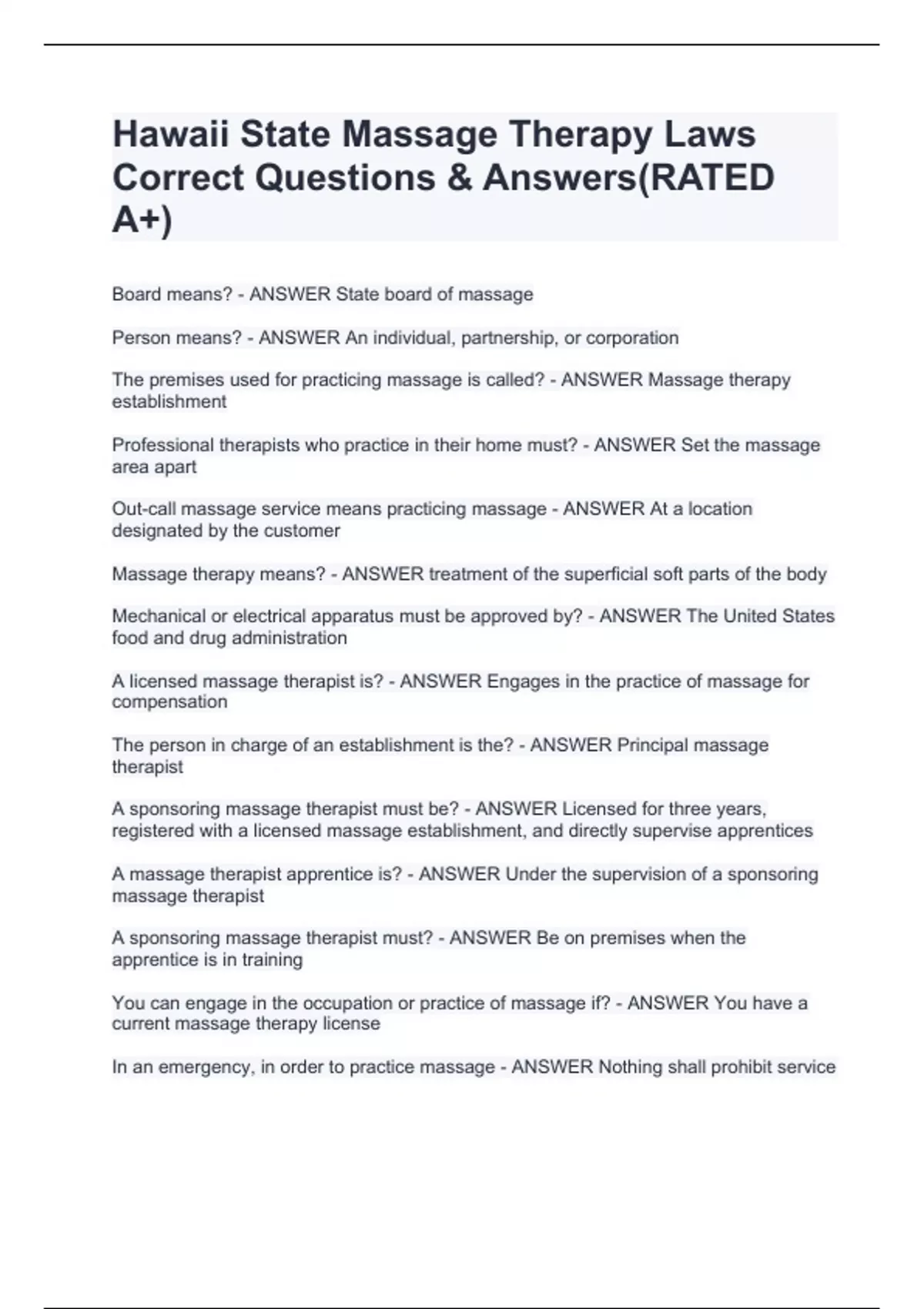 Hawaii Massage EXAM PACK|QUESTIONS & ANSWERS 100% CORRECTHawaii Massage EXAM PACK|QUESTIONS & ANSWERS 100% CORRECTHawaii Massage EXAM PACK|QUESTIONS & ANSWERS 100% CORRECTHawaii Massage EXAM PACK|QUESTIONS & ANSWERS 100% CORRECTHawaii Massage EXAM PACK|QUESTIONS & ANSWERS 100% CORRECTHawaii Massage EXAM PACK|QUESTIONS & ANSWERS 100% CORRECTHa