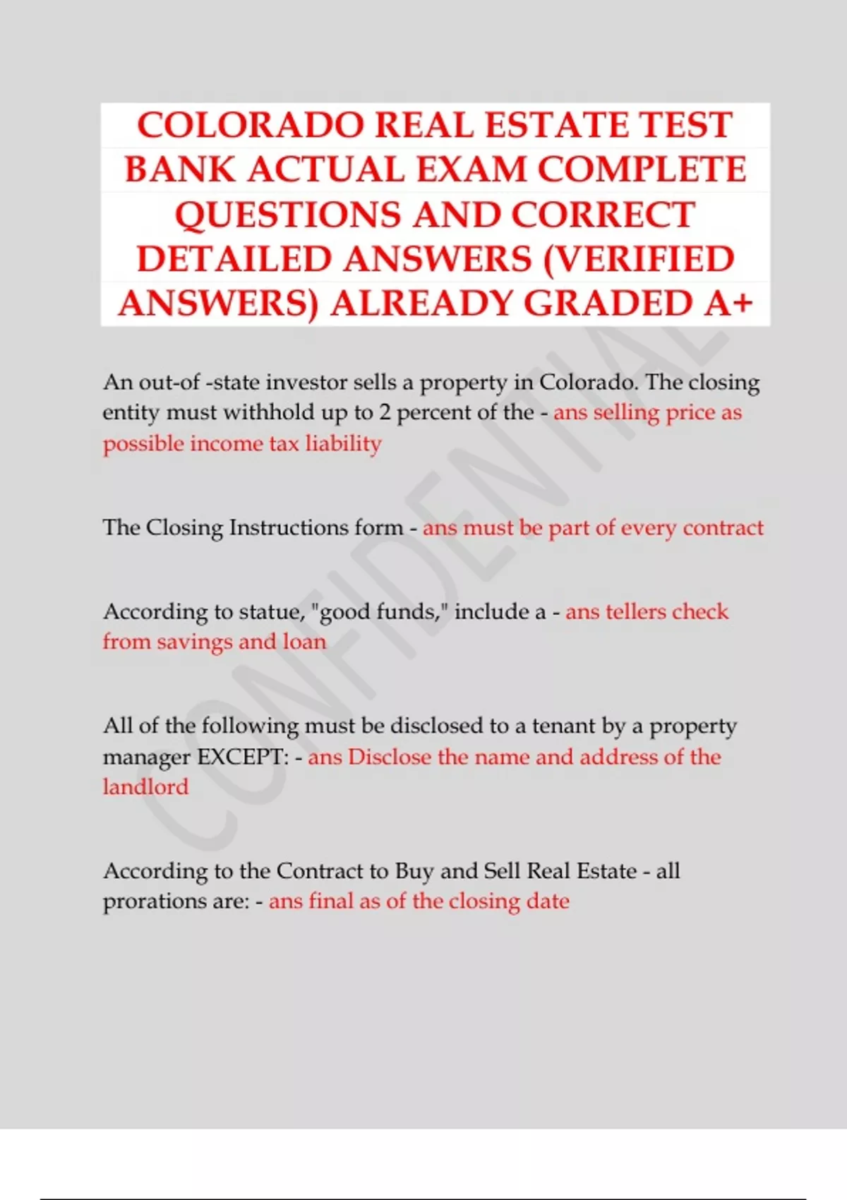 COLORADO REAL ESTATE TEST BANK ACTUAL EXAM COMPLETE QUESTIONS AND CORRECT DETAILED ANSWERS 2024 GRADED A+COLORADO REAL ESTATE TEST BANK ACTUAL EXAM COMPLETE QUESTIONS AND CORRECT DETAILED ANSWERS 2024 GRADED A+