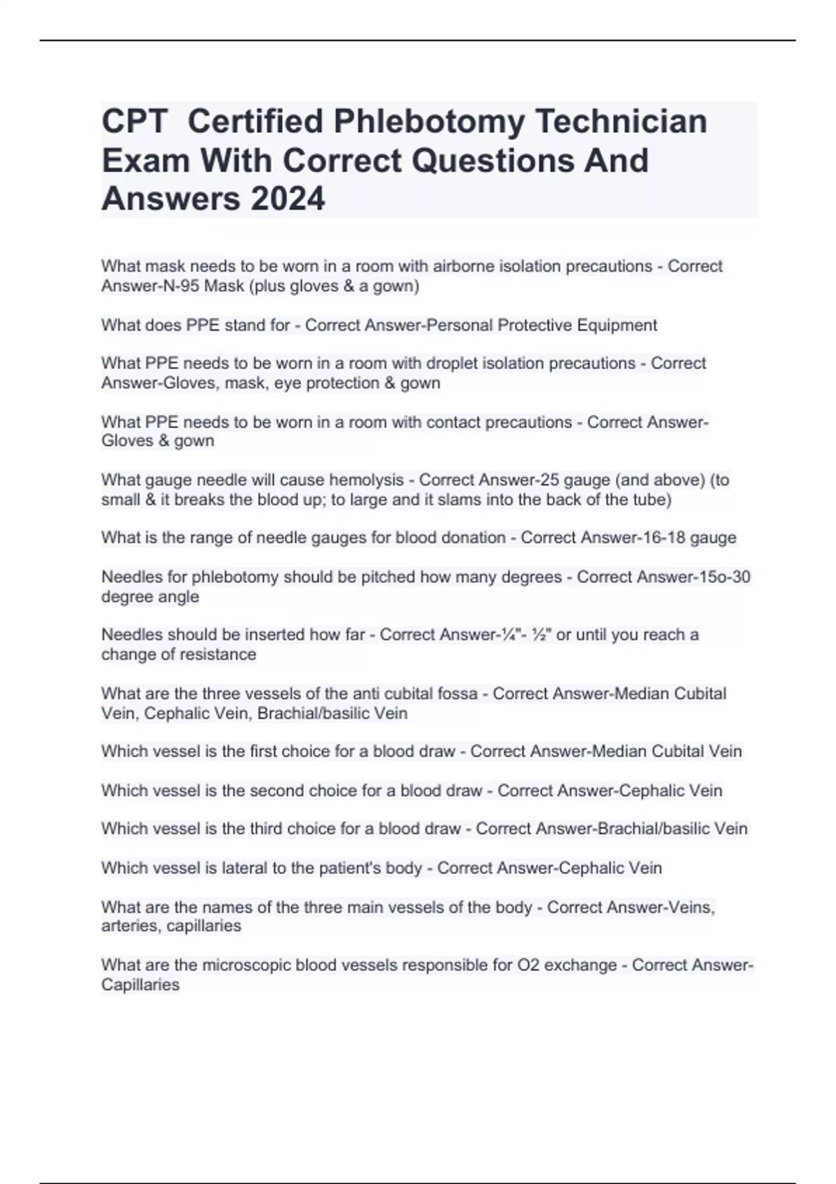 NHA PNHA Certified Phlebotomy Technician CPT Study Guide Exam With Correct Questions And Answers 2024 Phlebotomy Technician Practice Test 1 NHA Exam With Correct Questions And Answers 202 Certification EXAM With Correct Questions And Answers | VerifiCPT Certified Phlebotomy Technician Exam With Correct Questions And Answers 2024 ed Solutions 2024