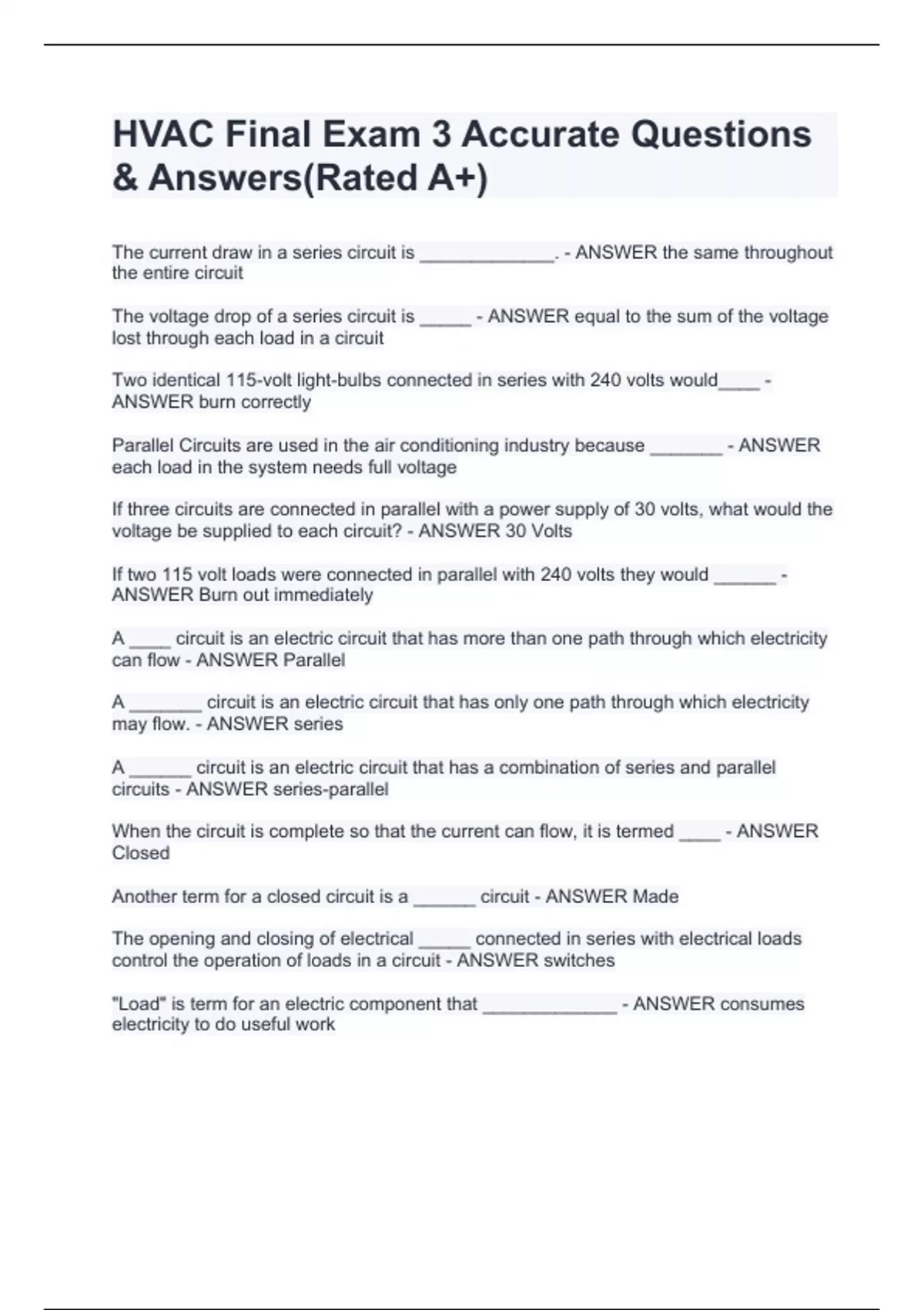 HVAC Electrical Test| 100 Questions | Correct Answers(SCORED A+)