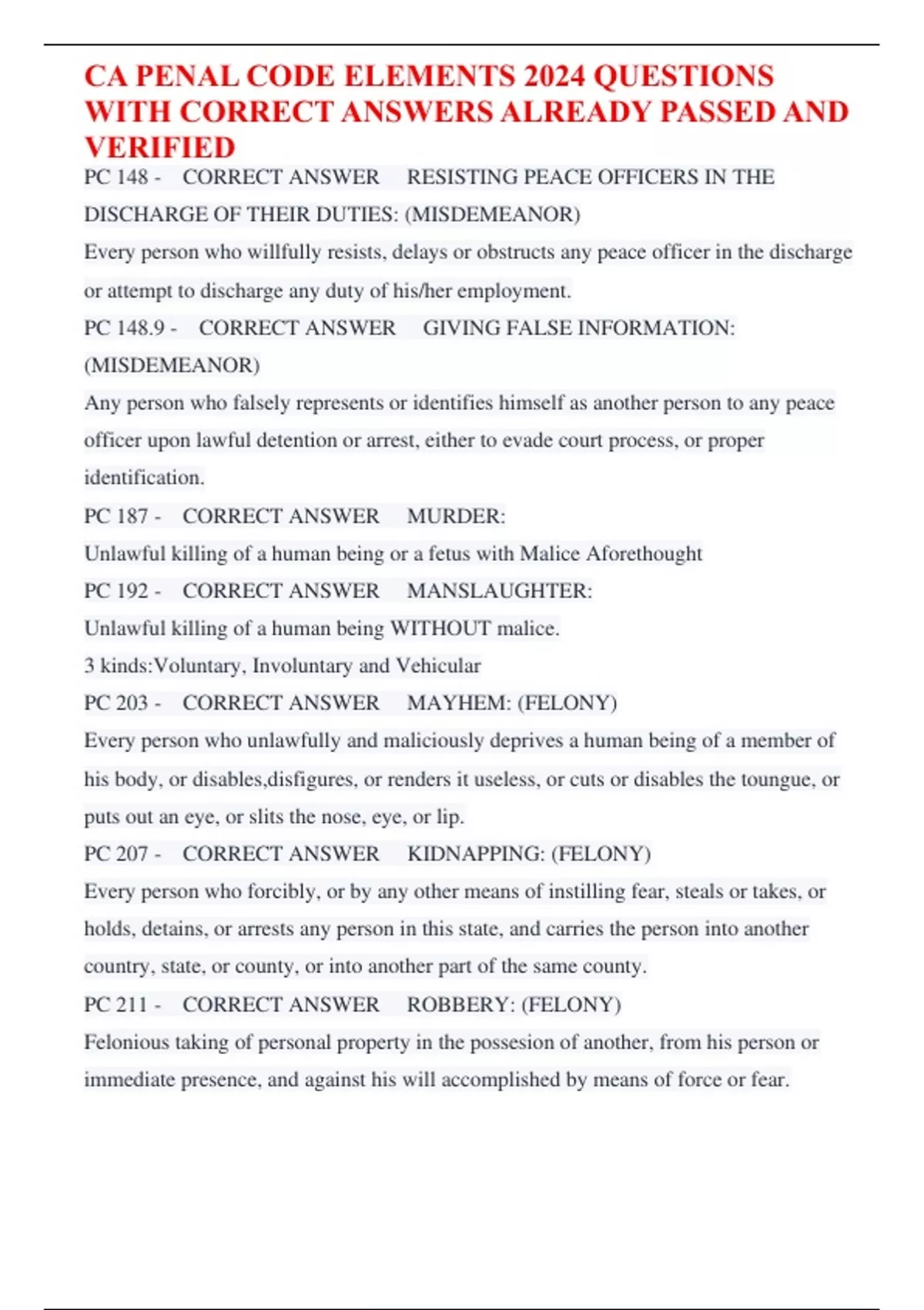 CA PENAL CODE ELEMENTS 2024 QUESTIONS WITH CORRECT ANSWERS ALREADY PASSED AND VERIFIED/CODE OF ETHICS. 2024/CA POLICE CODES (PENAL, VEHICAL AND RADIO CODES) 2024/CODE OF ETHICS AND RESPONSIBILITES 2024/CHAPTER 6 CODE OF ETHICS 2024/NASW CODE OF ETHICS 2024