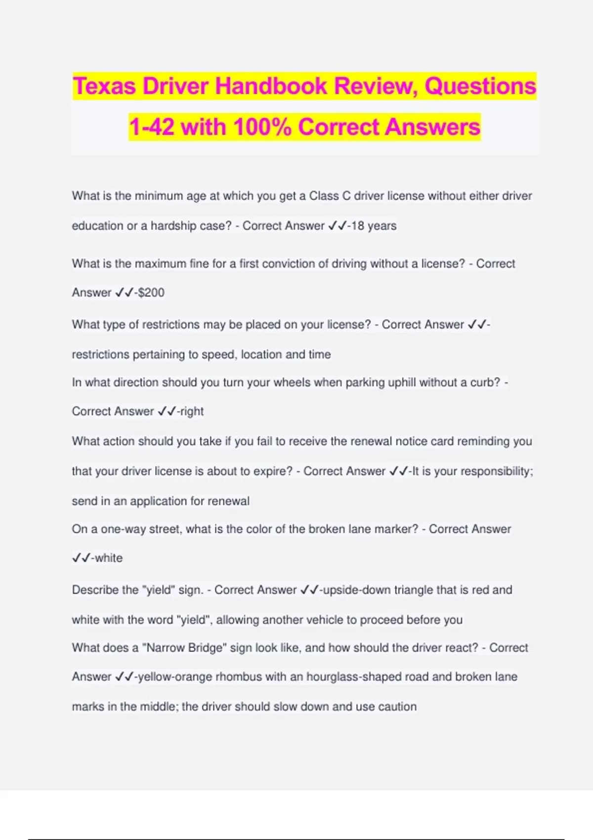 Texas Driver Handbook Review, Questions 1-42 with 100% Correct Answers