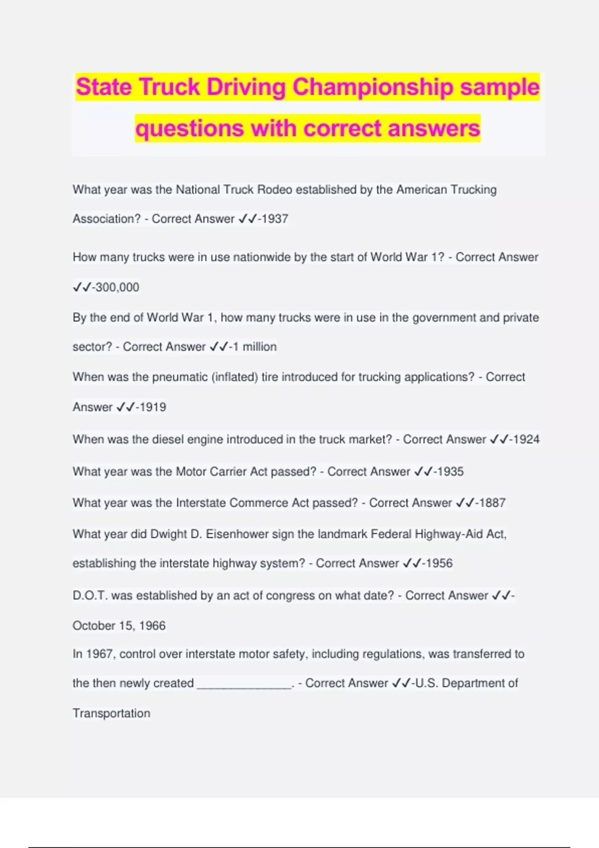State Truck Driving Championship sample questions 2024 with 100% correct answers