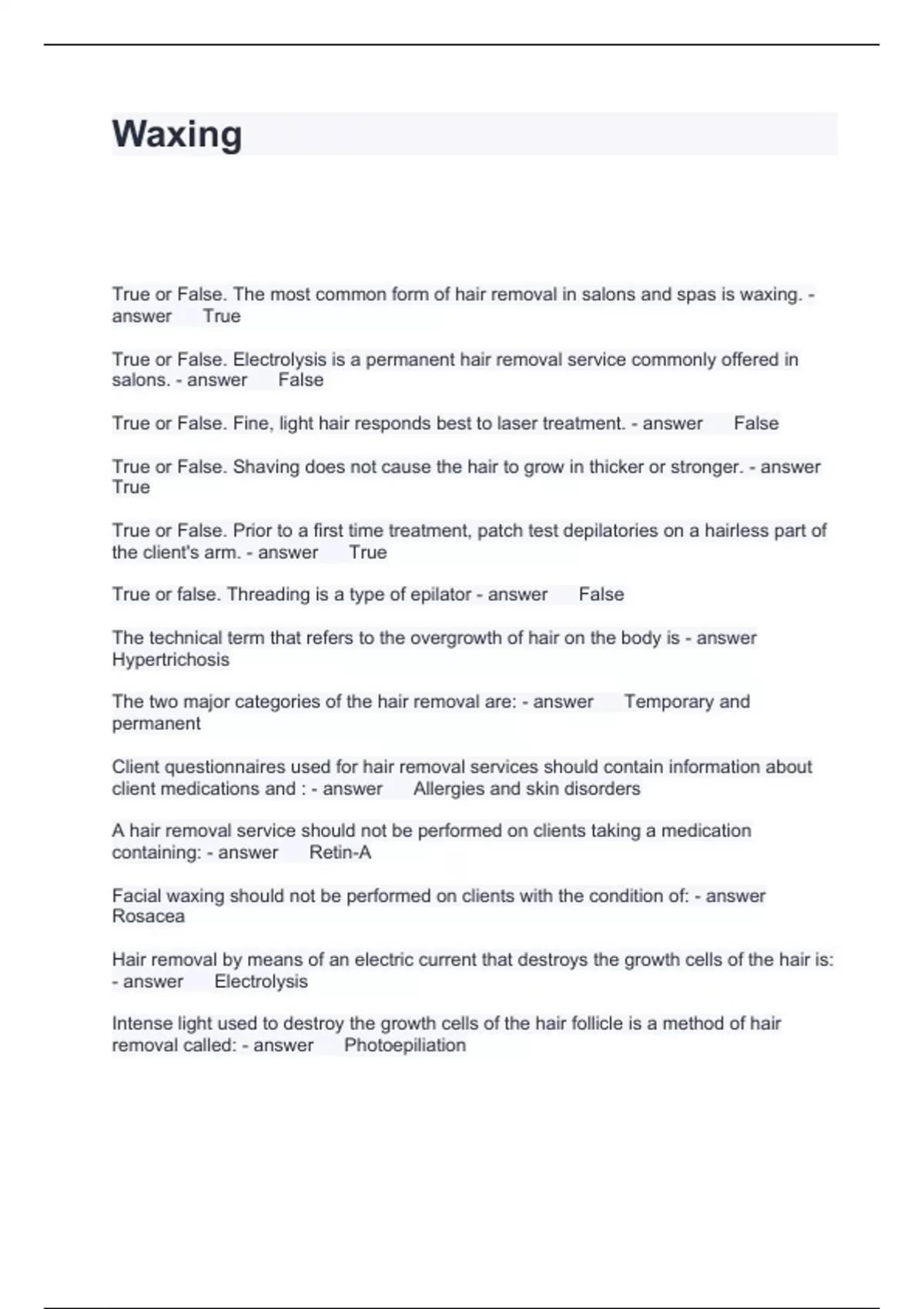 Exam (elaborations) 109E Hair removal Questions and Answers 2024 Exam (elaborations) beauty level 2 waxing exam revision Questions with correct Answers 2024 Exam (elaborations) Ch 11 Hair Removal Questions and Answers 2024 Exam (elaborations) Ch 17 Milady Hair Removal Questions and Answers 100% correct Exam (elaborations) Ch. 11 - Hair Rem