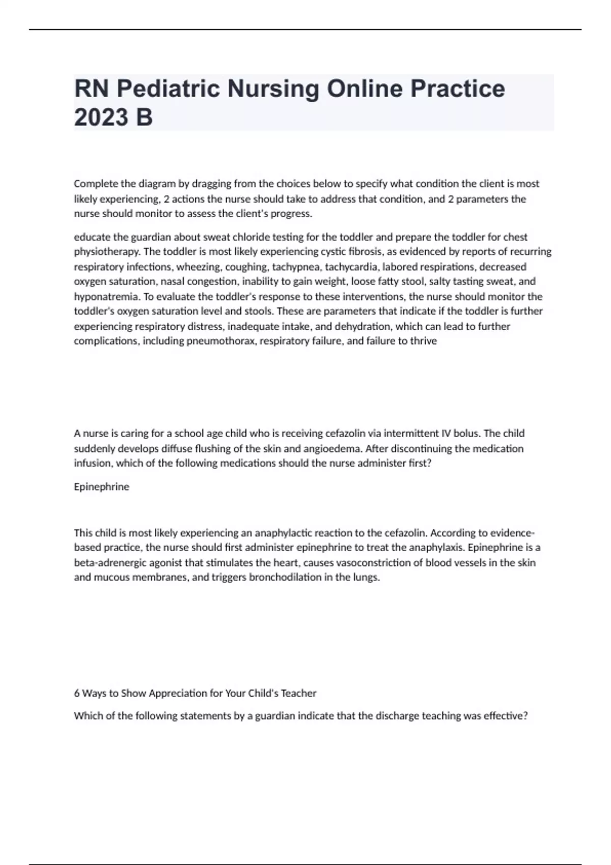 1 Exam (elaborations) Pediatric Nursing Exam 4 questions well answered 2024 2 Exam (elaborations) Pediatric Nursing - Midterm questions with correct answers 2024 3 Exam (elaborations) HESI Case Studies: RN Pediatrics : Acute Lymphoblastic Leukemia (ALL)2024 passed 4 Exam (elaborations) Pediatric NCLEX Questions with 100% correct answers
