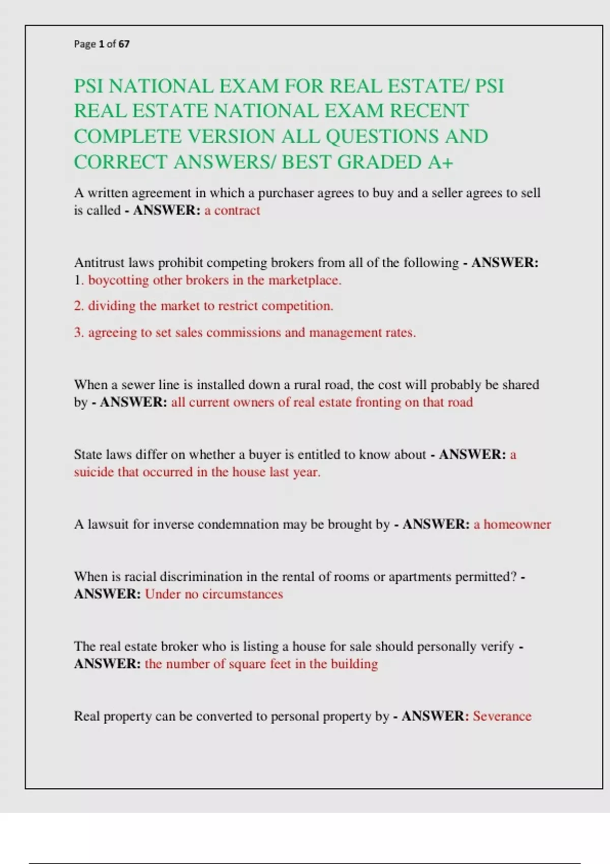 PACKAGE DEAL FOR PSI REAL ESTATE NATIONAL REAL ESTATE EXAM/ VA TATTOOING EXAM PSI/ PSI REAL ESTATE SALESPERSON EXAMINATION I/ PSI REAL ESTATE SALESPERSON EXAMINATION I/ PSI REAL ESTATE SALES PERSON EXAM RECENT COMPLETE VERSION ALL QUESTIONS AND ANSWERS/ BEST GRADED +