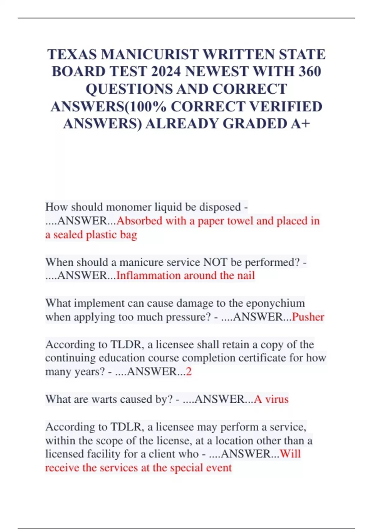 A PACKAGE DEAL FOR TEXAS MANICURIST WRITTEN EXAM AND STATE BOARD 2024 NEWEST EXAM ACTUAL EXAM WITH VERIFIED QUESTIONS AND CORRECT ANSWERS /ALREADY GRADED A+