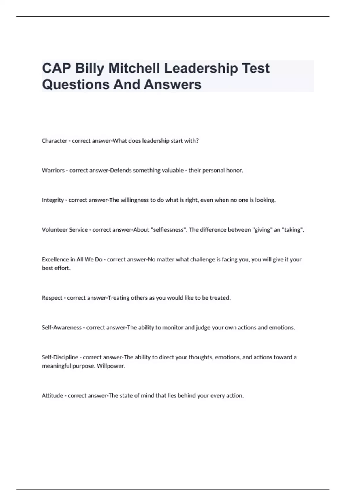 CAP Billy Mitchell Leadership Test Questions And Answers CAP Mitchell Award Leadership Study Guide Iatest Updated
