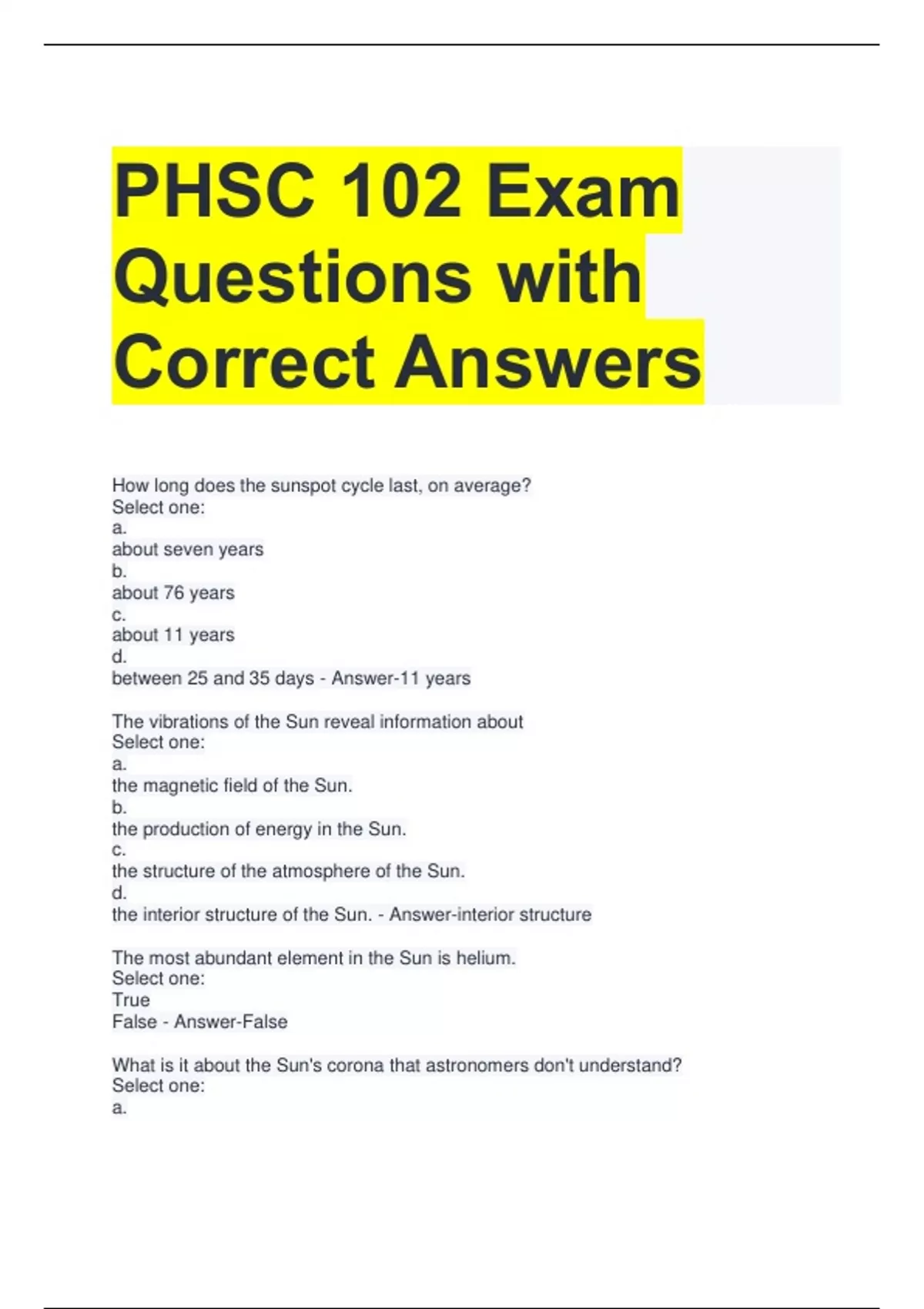 PHSC102 Midterm study Guide Questions and Answers 2 Exam (elaborations) PHSC 102 Life in the Universe Exam Questions with Correct Answers 3 Exam (elaborations) PHSC 102 Exam 2 Questions with All Correct Answers 4 Exam (elaborations) PHSC 102 FINAL EXAM QUESTIONS AND ANSWERS ALL CORRECT 5 Exam (elaborations) PHSC 102 2024 Midterm Exam Questions