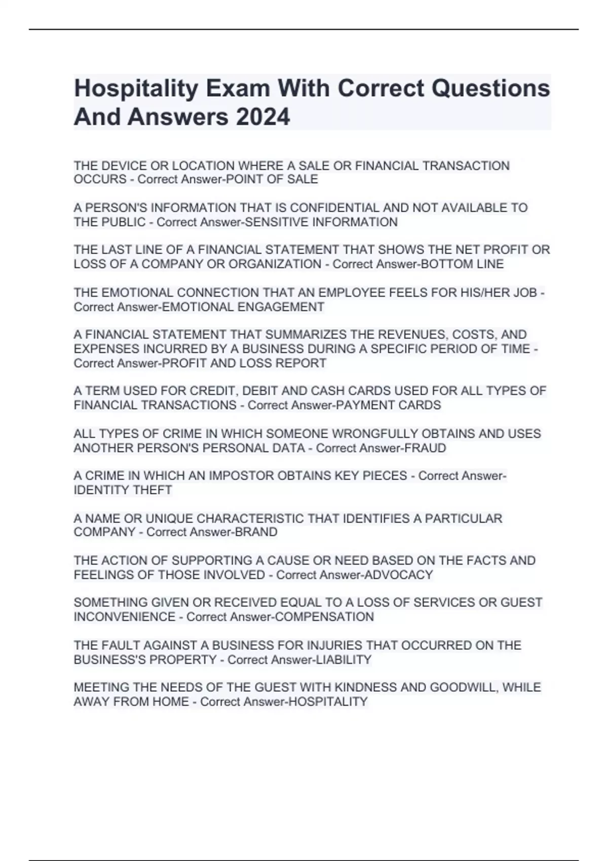 Package deal for Hospitality Exam With Correct Questions And Answers 2024