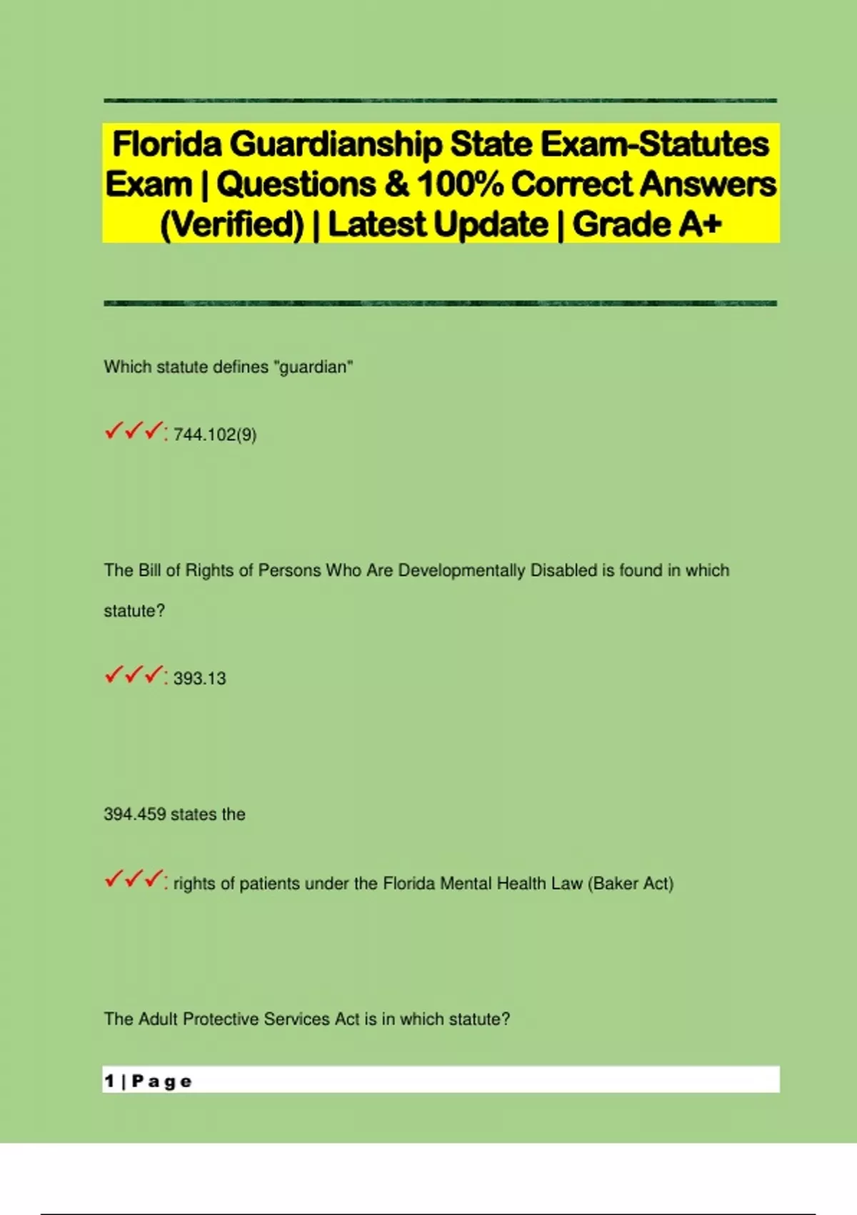 Florida Guardianship State Exam-Statutes Exam | Questions & 100% Correct Answers (Verified) | Latest Update | Grade A+