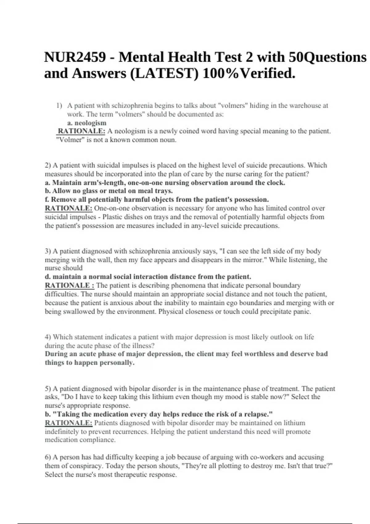 NUR 2459 Mental Health Exam 1 Modules 1-3 Questions and Answers, NUR2459 / NUR 2459 Final Exam 2023/2024 (2 NEW VERSIONS) Mental & Behavioral Health Nursing - Questions and Answers & NUR2459 - Mental Health Test 2 with 50Questions and Answers (LATEST) 100