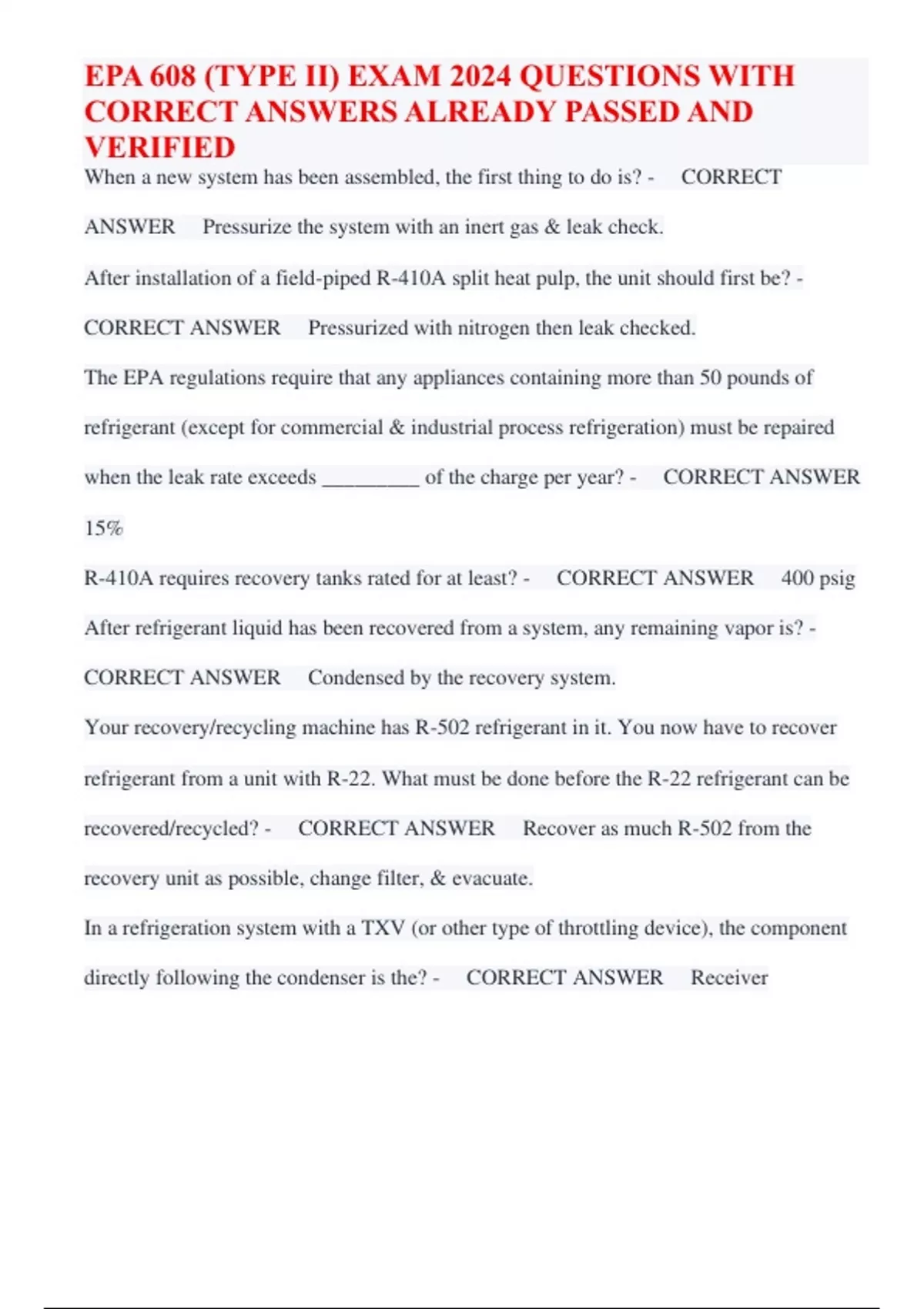EPA 608 (TYPE II) EXAM 2024 QUESTIONS WITH CORRECT ANSWERS ALREADY PASSED AND VERIFIED/EPA 608 TYPE III 2024/EPA 608 TYPE 3 2024/EPA 608 CORE 2024/EPA 608 2024/EPA 608 CORE 2024/EPA 608 CERTIFICATION (REFRIGERANT RECOVERY AND TRANSITION) 2024 /EPA 608 TYPE III 2024