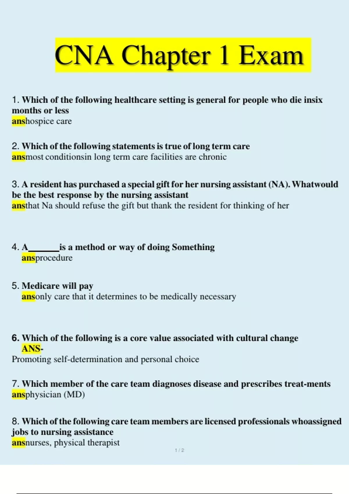 CNA Chapter 1 -9 Exam Questions And Answers (Verified Answers)