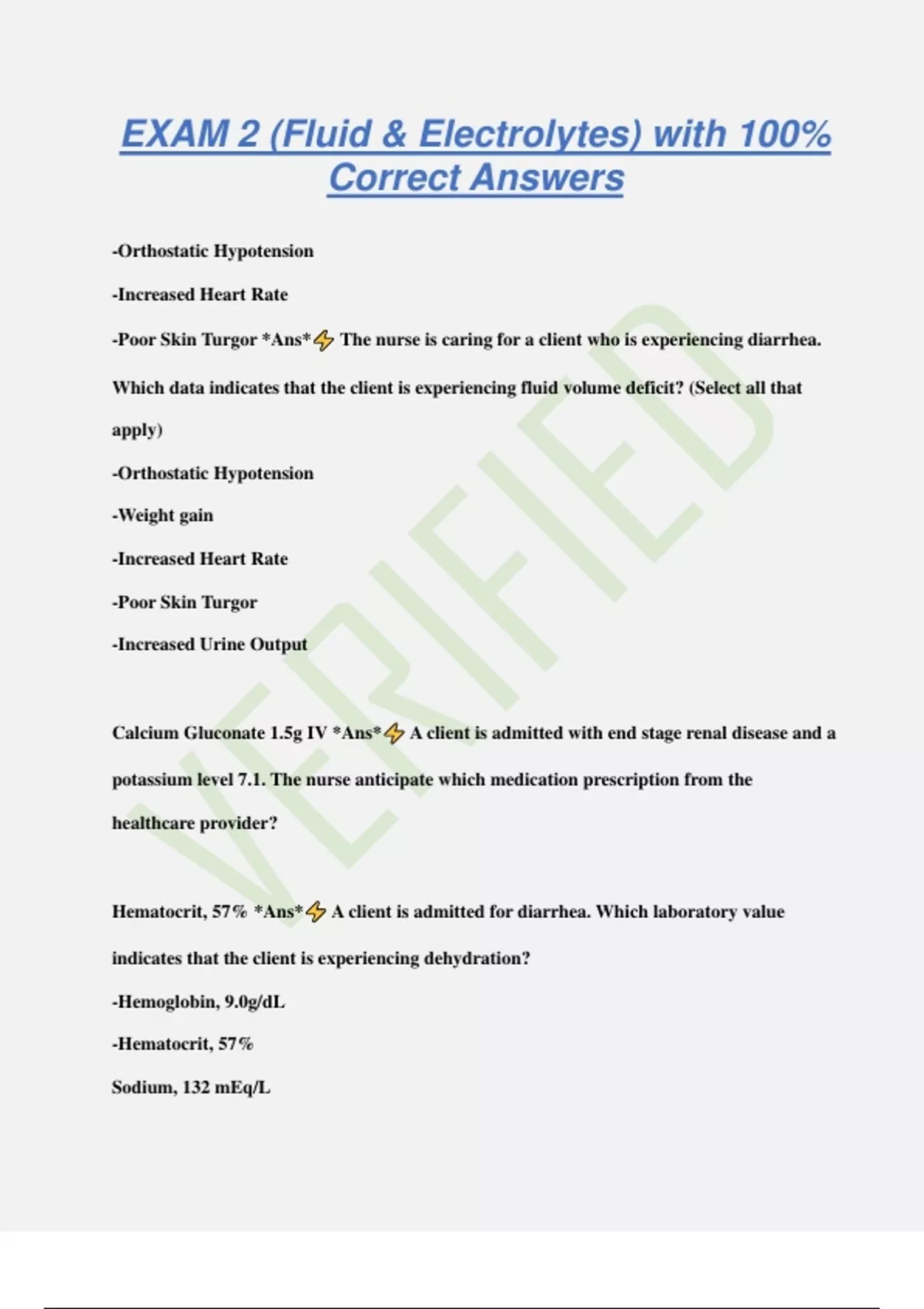 Final Workbook Exam Guide :Fluid & Electrolyte NCLEX with 100% Correct Answers