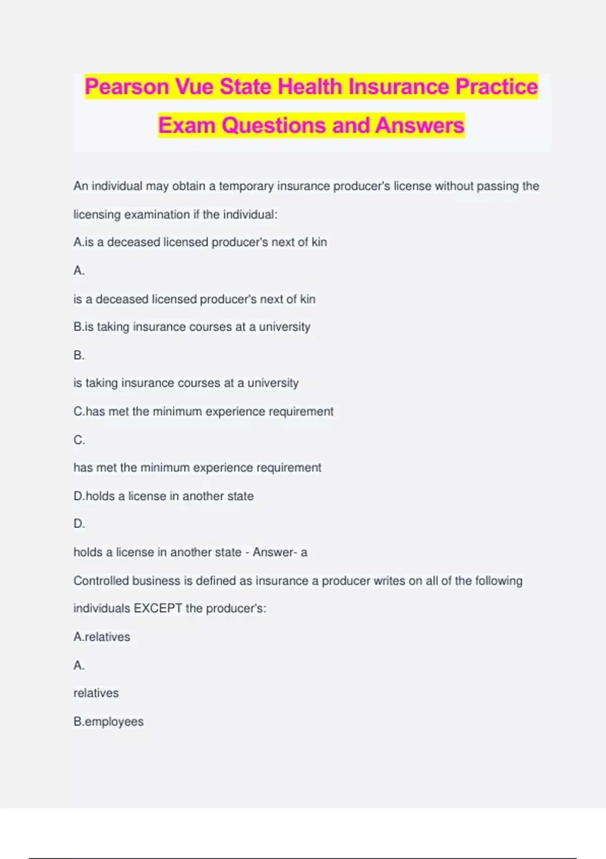 Pearson Vue State Health Insurance Practice Exam Questions and Answers