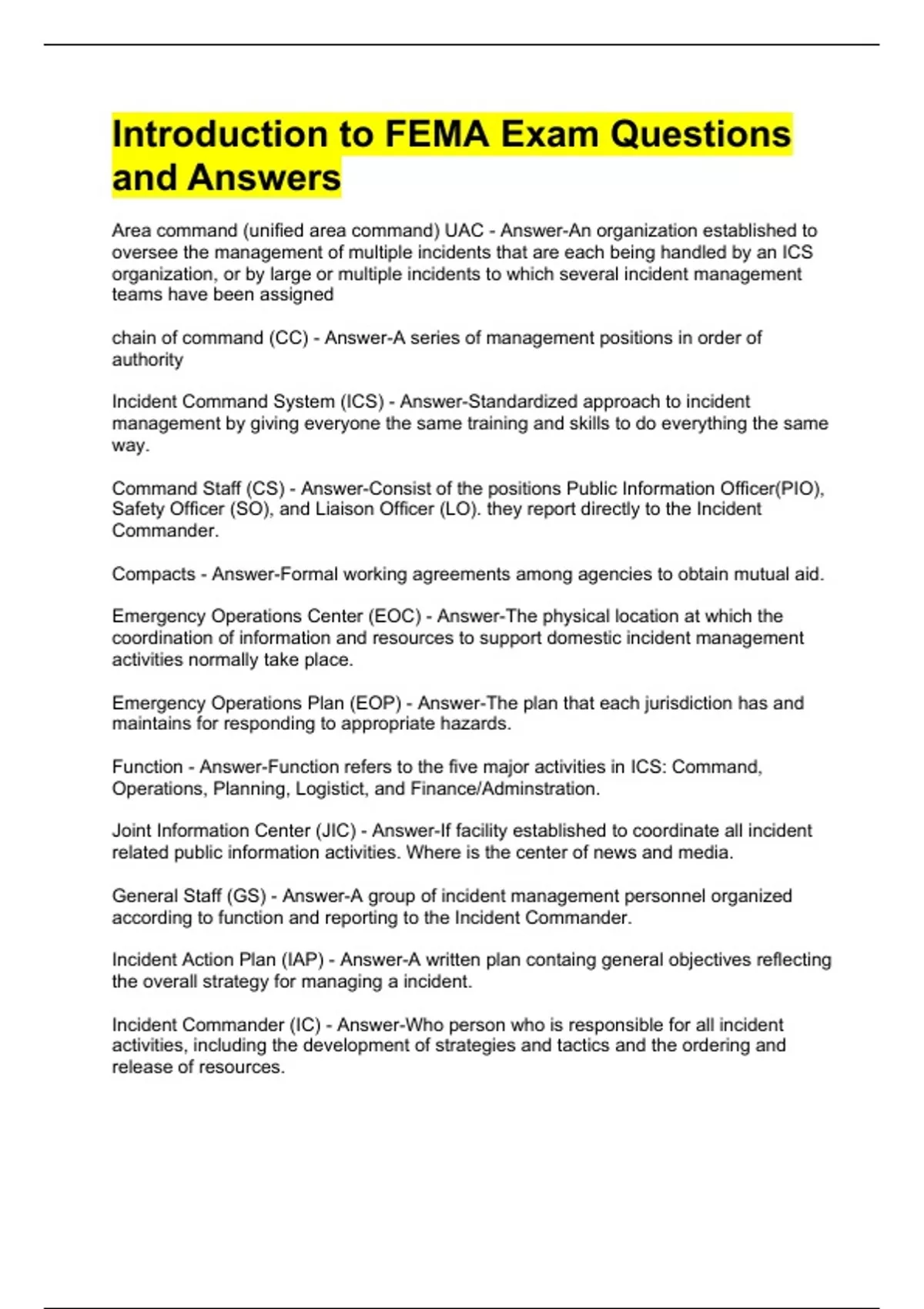 EMT FEMA Exam 100c Questions with Correct Answers 2 Exam (elaborations) FEMA - Lesson 1 Exam Questions with Correct Answers 3 Exam (elaborations) FEMA EXAM QUESTIONS AND ANSWERS 4 Exam (elaborations) FEMA EXAM QUESTIONS WITH CORRECT ANSWERS (RATED A+) 5 Exam (elaborations) FEMA Final Exam Questions with Correct Answers (Definite Pass) 6 Exam (