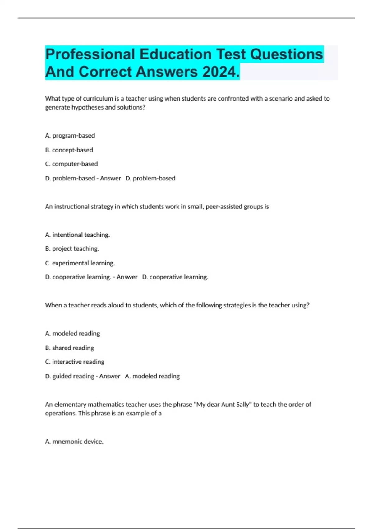 1 Exam (elaborations) FTCE Professional Education Florida Teacher Certification Exam And Answers Graded A+ 2024. 2 Exam (elaborations) FTCE Professional Education Exam Well Answered 100% 2024. 3 Exam (elaborations) FTCE Professional Education Practice Test Questions And Answers Rated A+ 2024.
