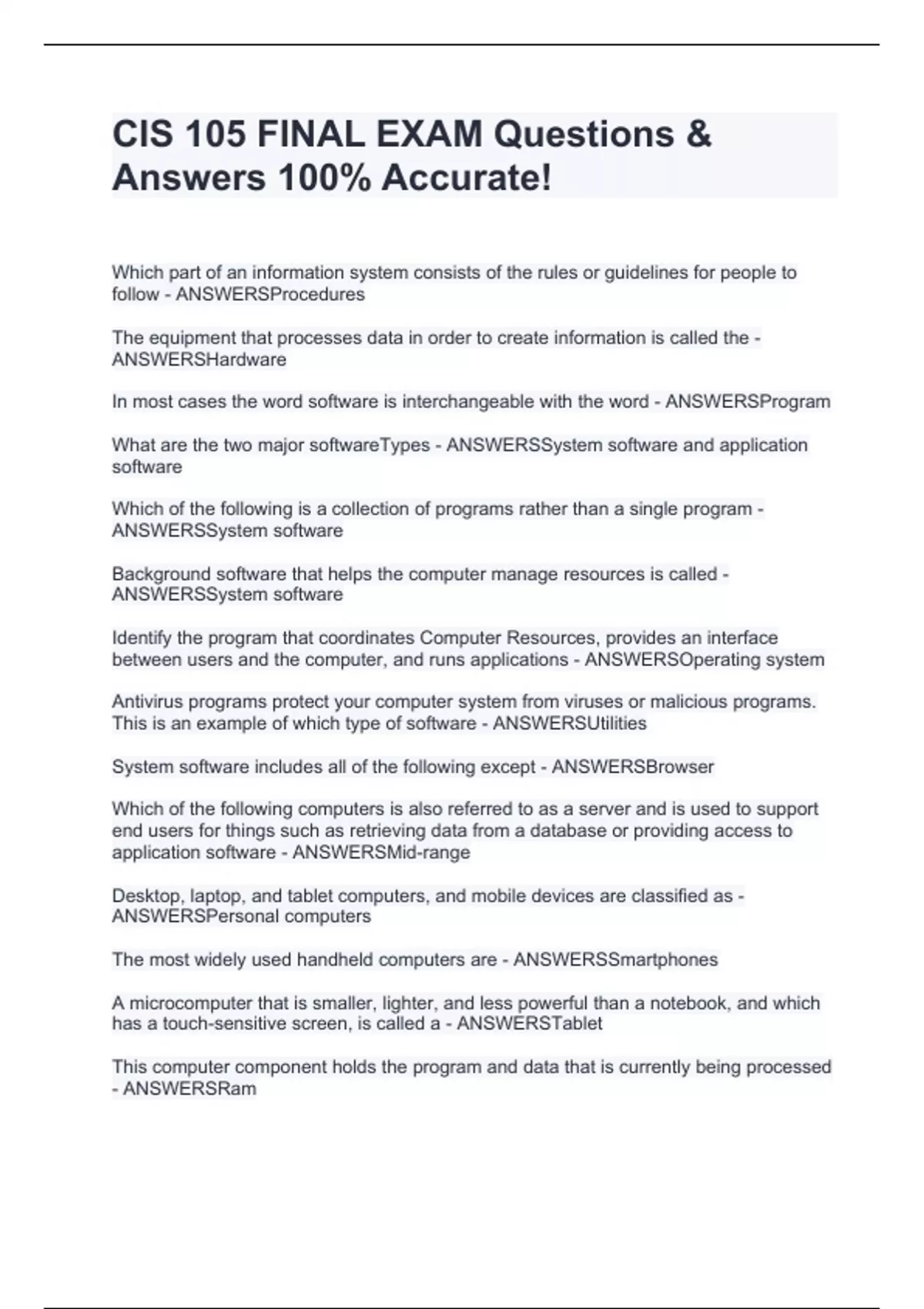 CIS105 FINAL EXAM PACKAGE DEAL (BUNDLE) WITH COMPLETE QUESTIONS AND ANSWERS 100% ACCURATE