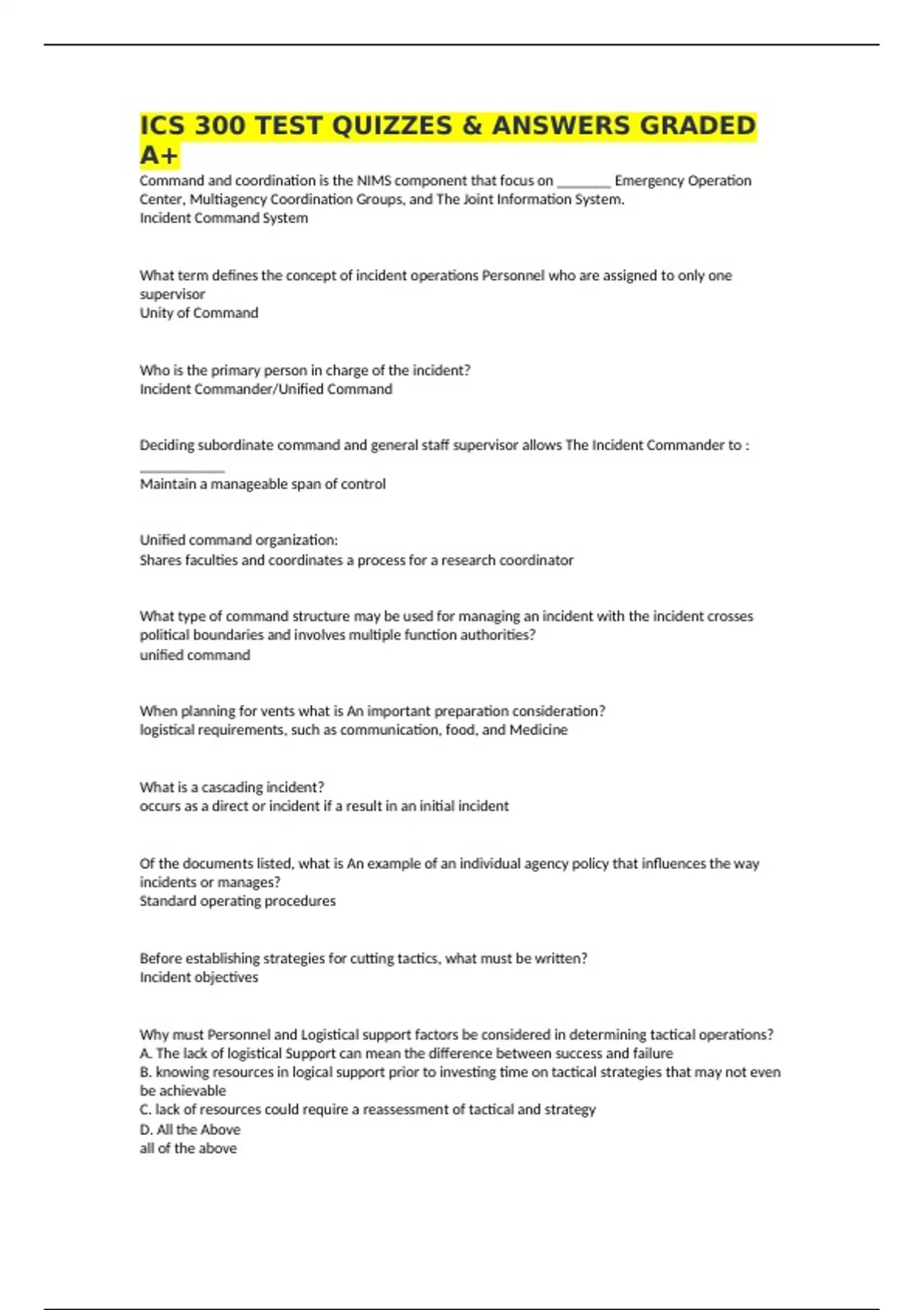 ICS 300 TEST QUIZZES & ANSWERS GRADED A+ |Latest Update!!! 2 Exam (elaborations) NIMS ICS-300: Final Exam Questions With Solved Solutions Graded A+ 3 Exam (elaborations) ICS-300: Intermediate ICS for Expanding Incidents Quizzes & Ans.. Graded A+ 4 Exam (elaborations) ICS 300 Final Exam |Completed with A+ Graded Answers!!! 5 Exam (elaborations)