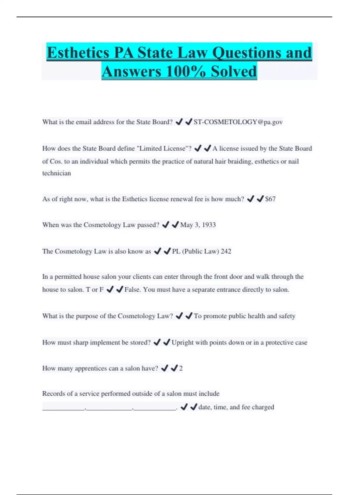 Esthetics PA State Law Questions and Answers 100% Solved