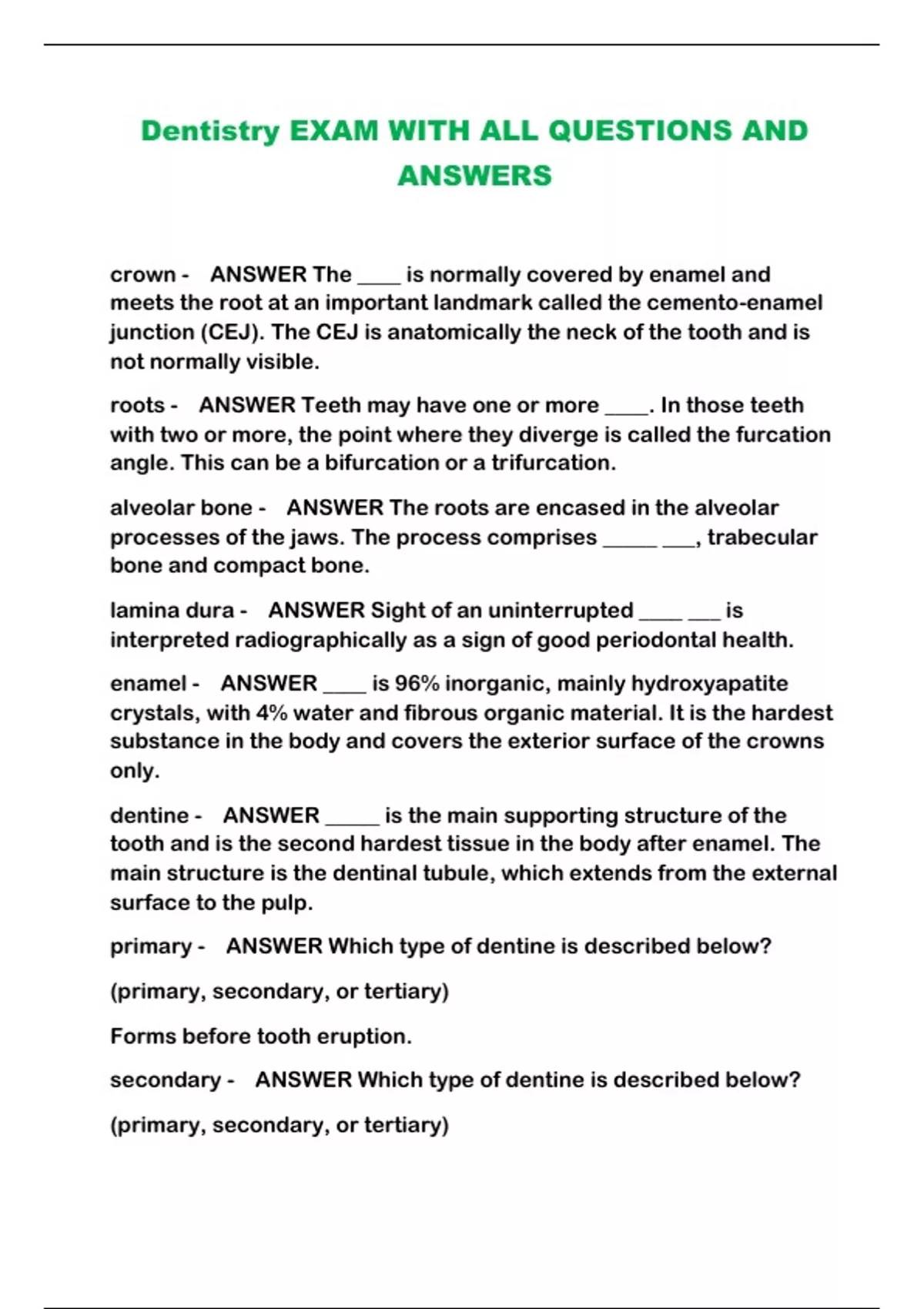 Dentistry EXAM WITH ALL QUESTIONS AND ANSWERS