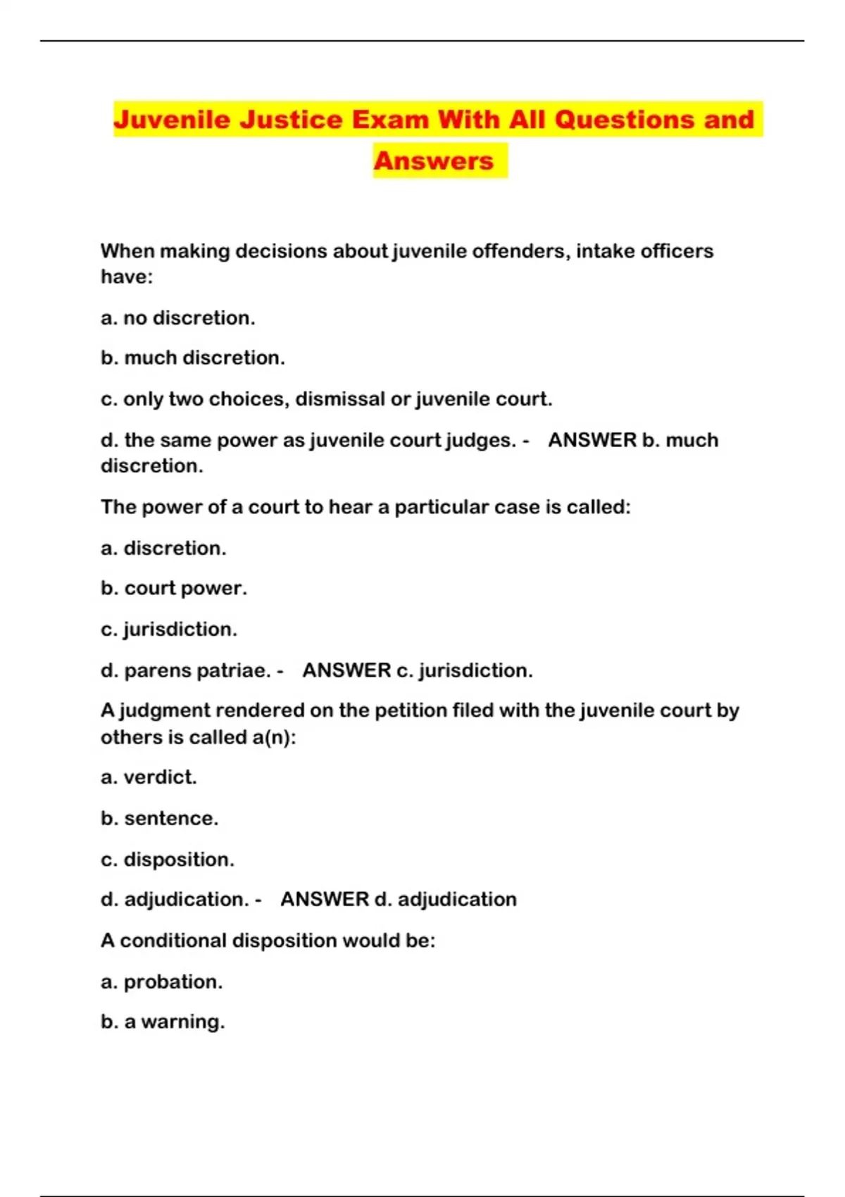 Juvenile Justice Study Exam With Questions and Answers