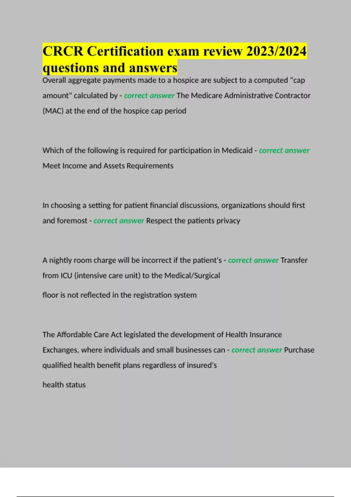 CRCR FINAL EXAMs WITH CORRECT ANSWERS CRCR FINAL EXAMs WITH CORRECT ANSWERS CRCR FINAL EXAMs WITH CORRECT ANSWERS