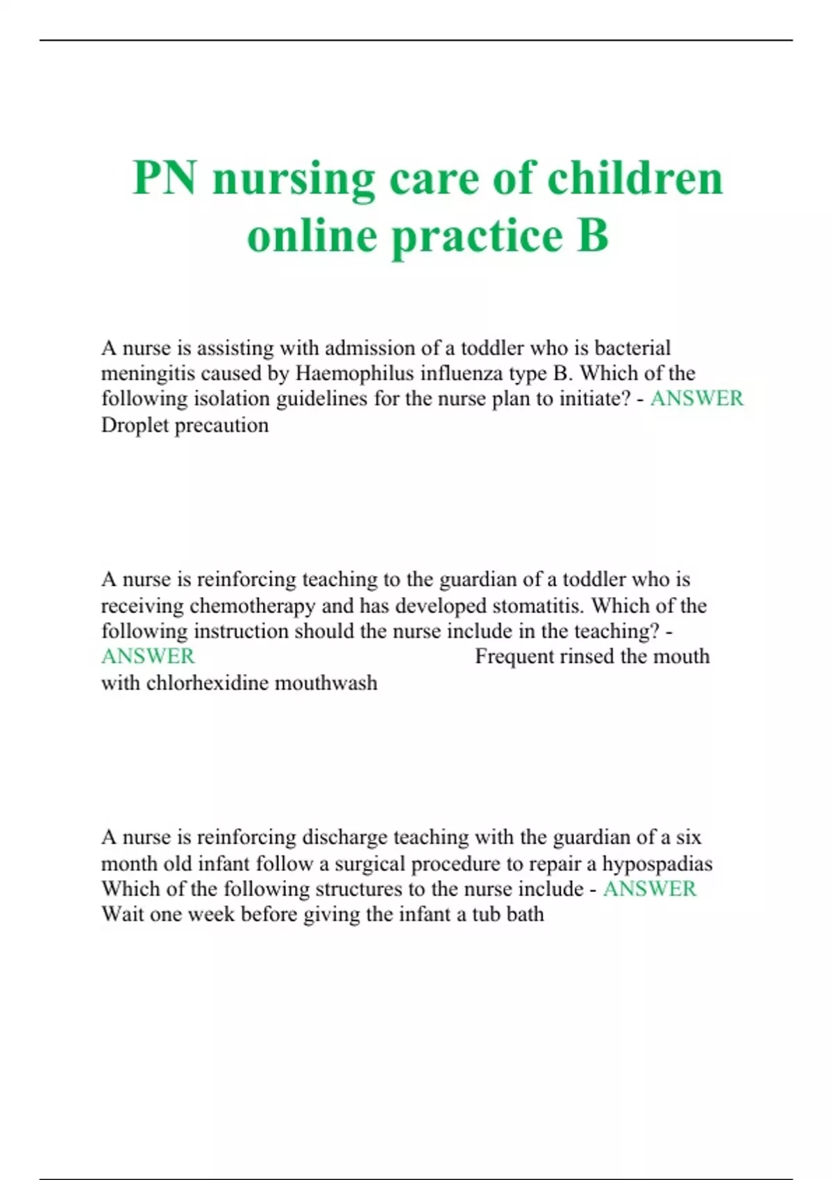Exam (elaborations) ATI PN Nursing Care of Children Online Practice 2017 B 2 Exam (elaborations) Learning System RN 3.0 Nursing Care of Children Final Quiz 3 Exam (elaborations) PN Pediatric Nursing Practice 2023 A 4 Exam (elaborations) PN Children Practice 2023 B 5 Exam (elaborations) PN nursing care of children online practice B