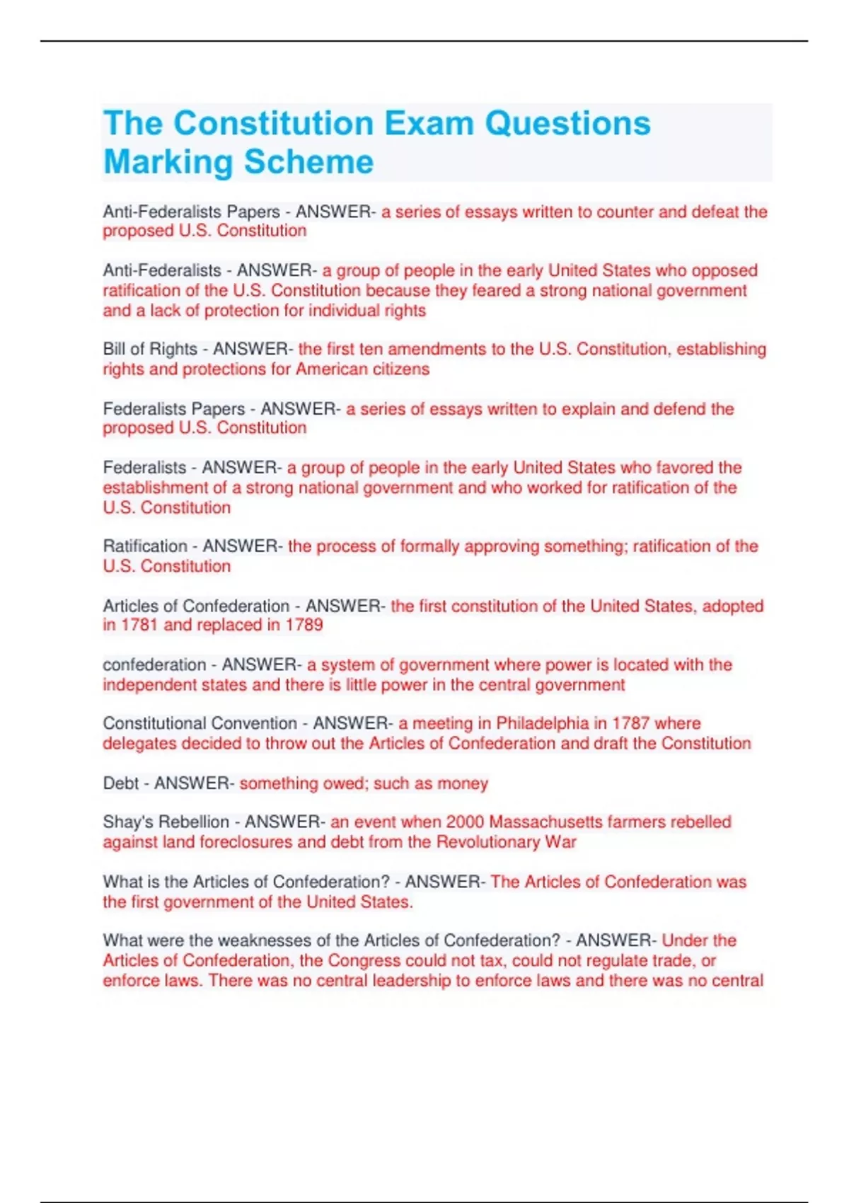 1 Exam (elaborations) Constitution Test Review Questions with Answers 2 Exam (elaborations) Constitution Test Questions with Correct Answers 3 Exam (elaborations) Constitution Test with Complete Solutions 4 Exam (elaborations) Constitution Study Questions with Correct Answers 5 Exam (elaborations) Constitution Test Questions with All Correct An