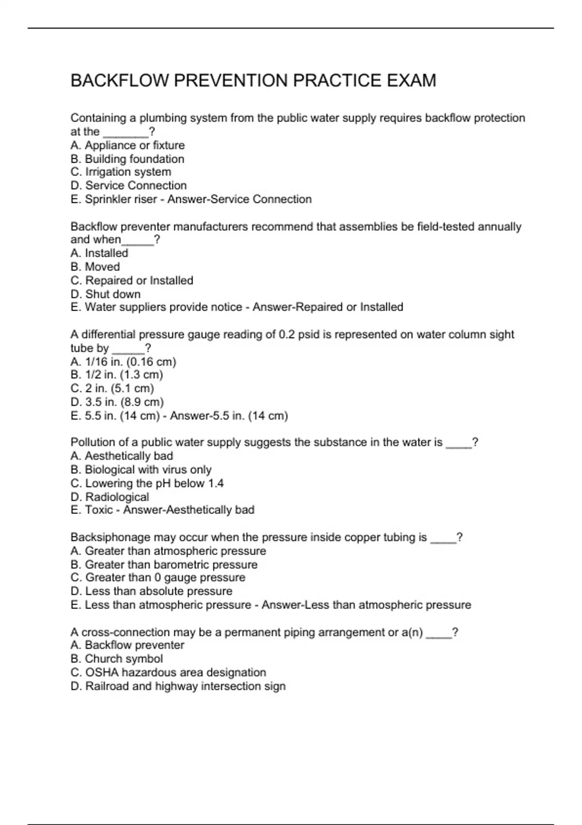 Backflow Prevention Practice Exam 2 Exam (elaborations) BACKFLOW TROUBLESHOOTING QUIZ 3 Exam (elaborations) SAMPLE EXAM QUESTIONS AND RECOMMENDED REFERENCES FOR ABC S BACKFLOW PREVENTION ASSEMBLY TEST OR EXAM 4 Exam (elaborations) BACKFLOW PRACTICE EXAM 5 Exam (elaborations) BACKFLOW EXAM QUESTION AND ANSWERS 6 Exam (elaborations) BACKFLOW PRE