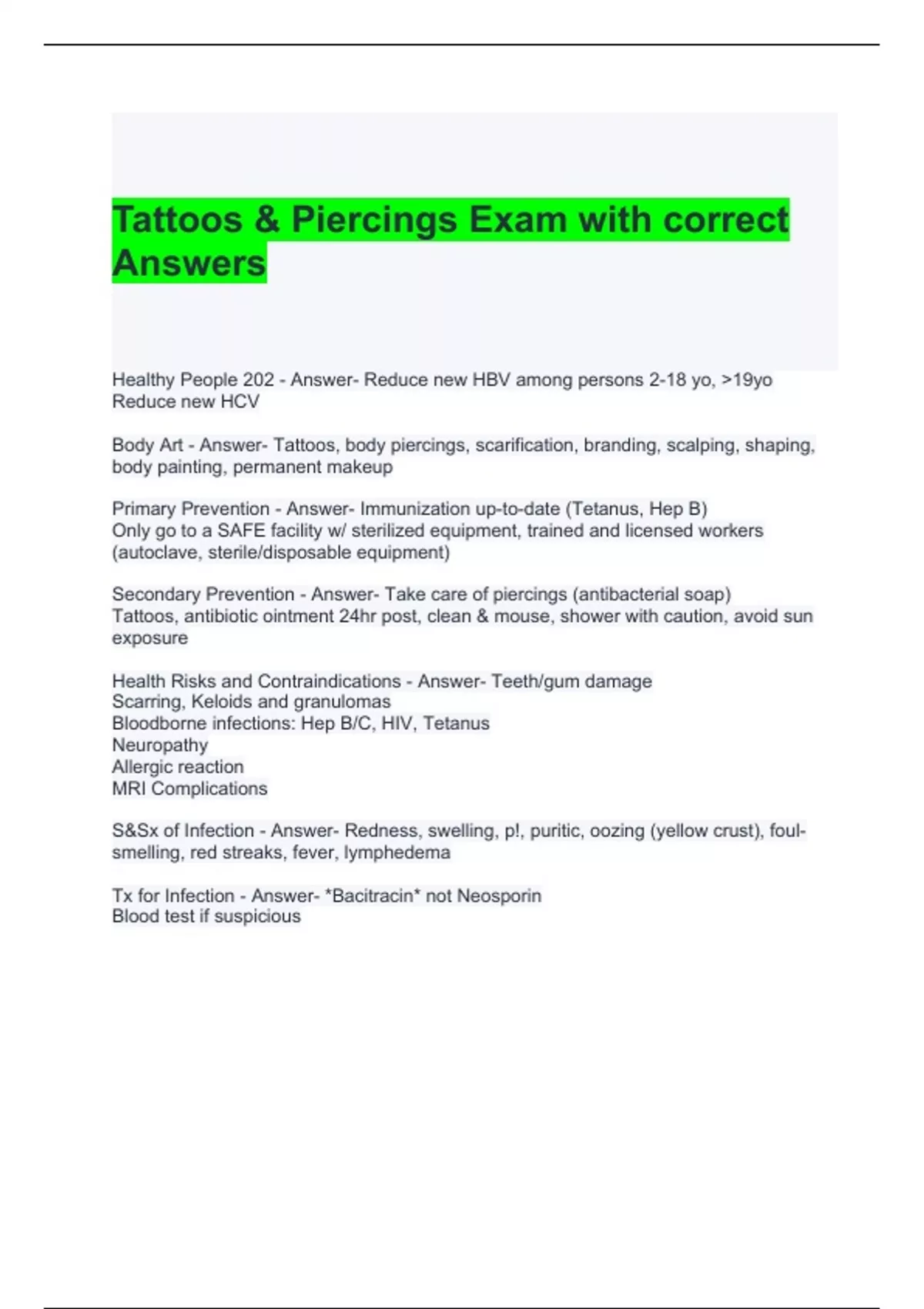 1 Exam (elaborations) Tattoos & Piercings Exam with correct Answers- Graded A 2 Exam (elaborations) Tattoos & Body Piercings Exam Questions and Answers 2024 3 Exam (elaborations) Tattoo-Body Piercing Terms Exam Questions and Answers 2024 4 Exam (elaborations) Tattoo test hot rod betties exam questions and answers 2024/ graded a 5 Exam (elaborat