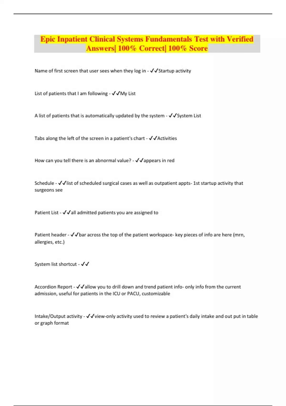 Epic Inpatient Clinical Systems Fundamentals Test with Verified Answers| 100% Correct| 100% Score
