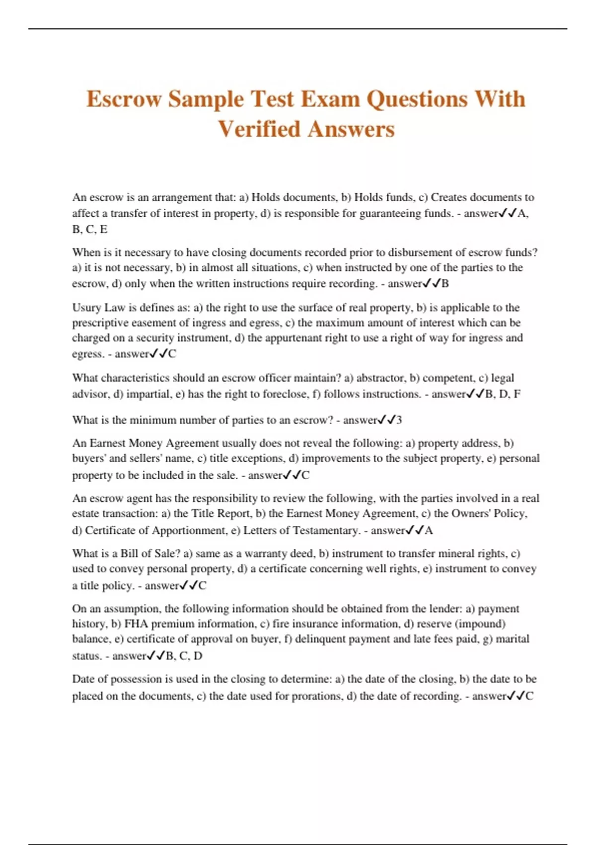 Escrow and Closing Exam Questions And Answers (Verified And Updated)