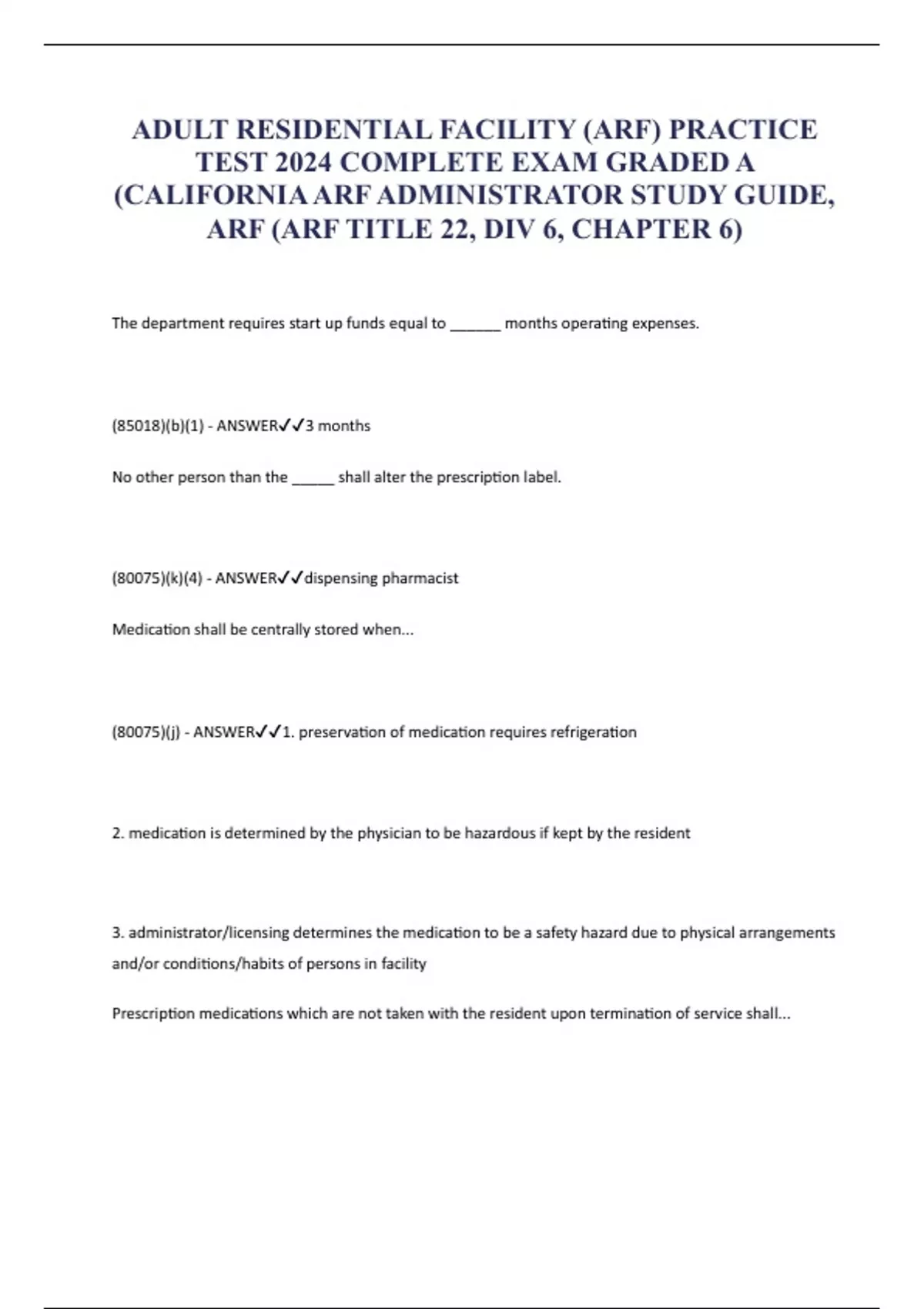 ADULT RESIDENTIAL FACILITY (ARF) ADMINISTRATOR CERTIFICATION ACTUAL EXAM 2024 COMPLETE EXAM GRADED A