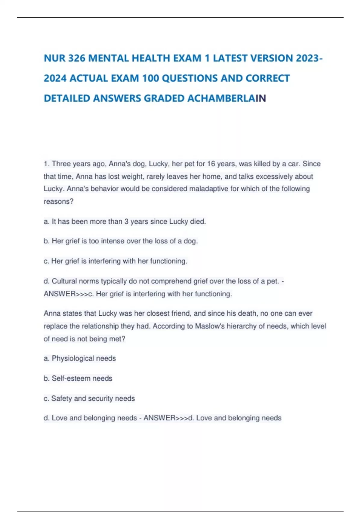 NUR 326 MENTAL HEALTH EXAM 1 LATEST VERSION ACTUAL EXAM 100 QUESTIONS AND ANSWERS