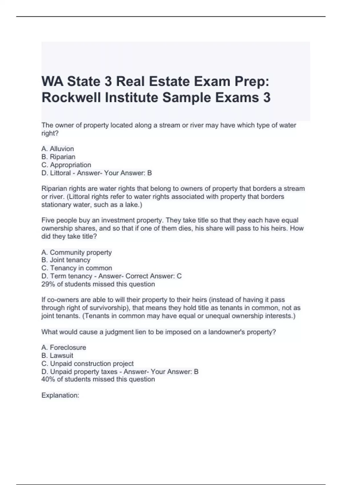 1 Exam (elaborations) WA State 3 Real Estate Exam Prep Rockwell Institute Sample Exams 3 Questions and Answers 2 Exam (elaborations) WA Real Estate Fundamentals Questions – Rockwell with correct Answers 3 Exam (elaborations) WA Real Estate exam part 2 questions and answers 4 Exam (elaborations) WA Real Estate - Chapter 1 Exam Questions and Answe