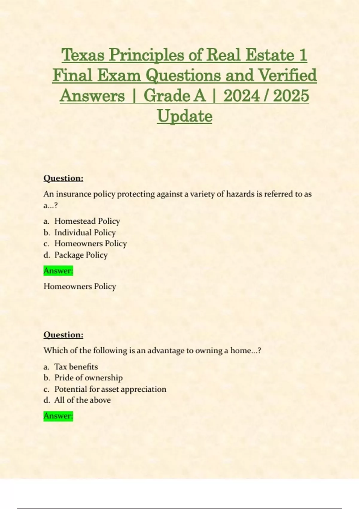 Texas Principles of Real Estate I & Texas Principles of Real Estate II Final Exams | Questions and Verified Answers | Grade A | 2024 / 2025 Updates STUDY BUNDLE WITH COMPLETE SOLUTIONS | 100% Guaranteed