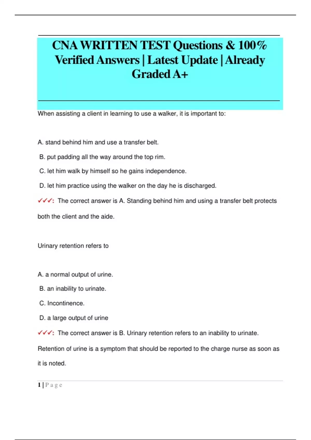 CNA WRITTEN TEST Correctly Answered Questions Pack| UpToDate