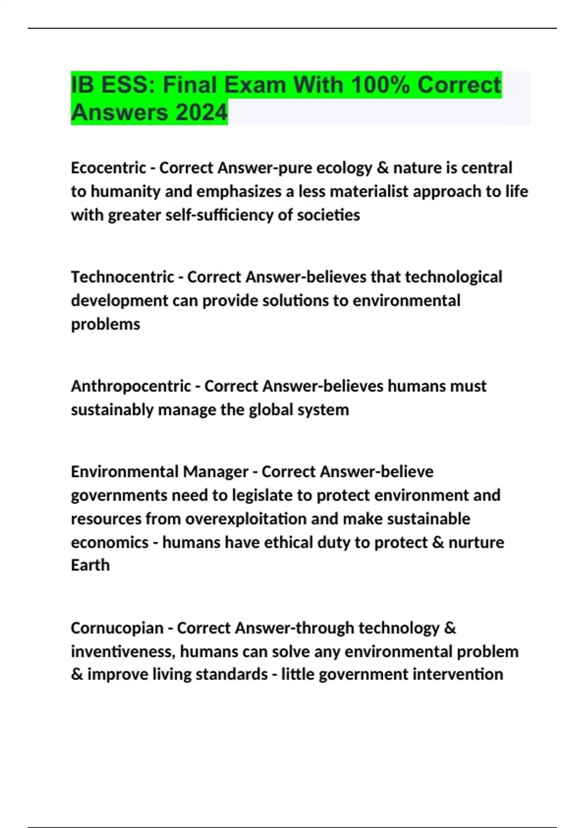 IB ESS Exam Questions with 100% Correct Answers | Verified | Latest Update IB ESS: Final Exam With 100% Correct Answers 2024 IB ESS Exam With 100% Correct Answers 2024 IB ESS Exam Review Questions With 100% Correct Answers 2024 IB ESS EXAM FULL EXAM REVIEW QUESTIONS WITH 100% CORRECT ANSWERS 2024 IB ESS Final Exam Questions With 100% Correct Answer